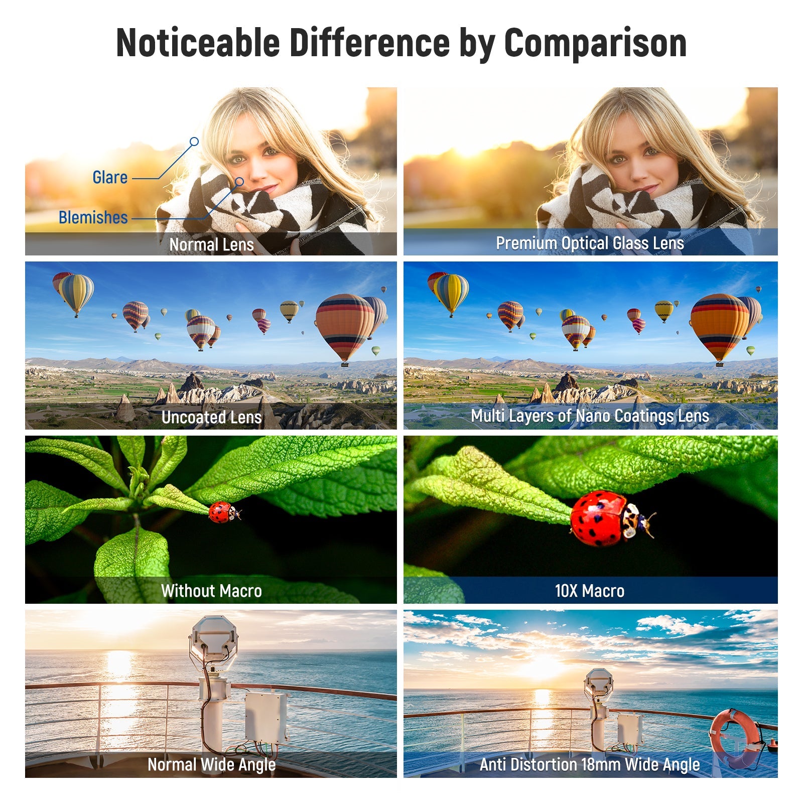 - Construcción de dos elementos con revestimiento múltiple : construida con 2 grupos de gafas correctivas ópticas HD de dos elementos, junto con múltiples capas de nanorrecubrimientos para reducir el reflejo y el deslumbramiento, la lente macro gran angular ofrece imágenes de alta resolución con colores naturales. Sin distorsión ni aberración cromática.