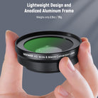 - Diseño liviano y doble rosca : el marco de la lente está fabricado con aluminio anodizado y pesa solo 2,5 oz/70 g, es liviano y duradero. Con roscas mecanizadas CNC precisas, la rosca trasera de Ø40,5 garantiza un montaje perfecto en su lente y la rosca frontal de 52 mm se puede conectar a varios filtros de 52 mm.