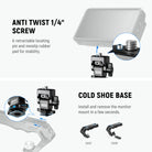 Tornillo de montaje universal de 1/4" : el tornillo de montaje de 1/4" se adapta a cualquier monitor de campo de 5"~7" con la rosca correspondiente. Utilice el tornillo de ajuste manual para un montaje conveniente y la llave hexagonal en forma de L incluida para volver a apretar el tornillo a través de las ranuras.