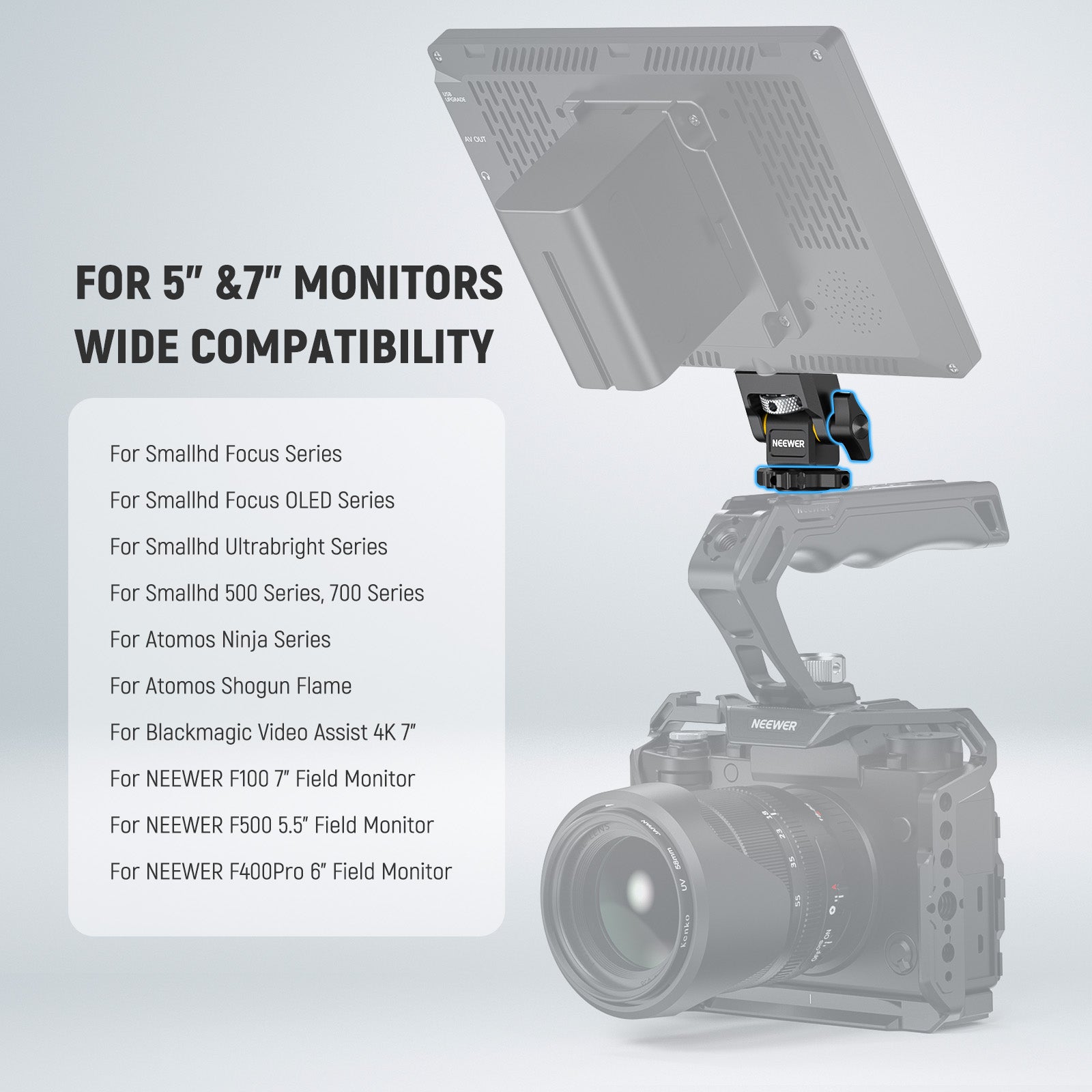 - Ideal para monitores de campo de 5"~7" : diseñado para admitir un monitor de campo de cámara de 5"~7" para vlogging, cine y fotografía, este soporte para monitor de campo con zapata fría se puede montar en jaulas de cámara, plataformas de video y parte superior de NEEWER. manijas, manijas laterales, manijas de cardán y zapatas para cámaras (también compatibles con SmallRig). La construcción de aleación de aluminio es duradera y resistente a las inclemencias del tiempo al aire libre.