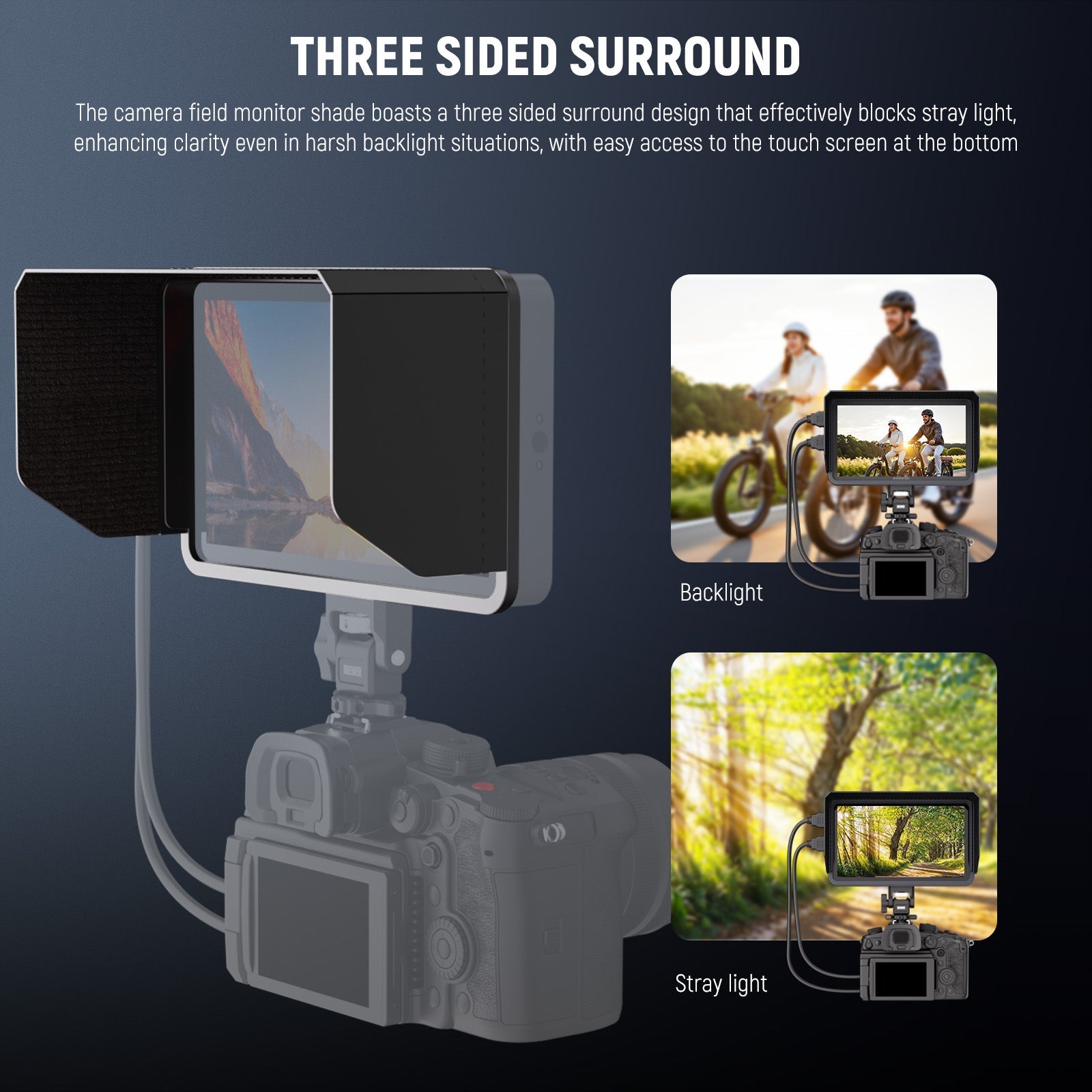 • Diseño ajustado y fácil acceso : el marco del parasol se ajusta perfectamente al monitor de campo NEEWER F700 sin interferir con el uso regular, lo que garantiza un acceso sin obstrucciones a los botones superiores y permite una configuración rápida del parasol cuando sea necesario.