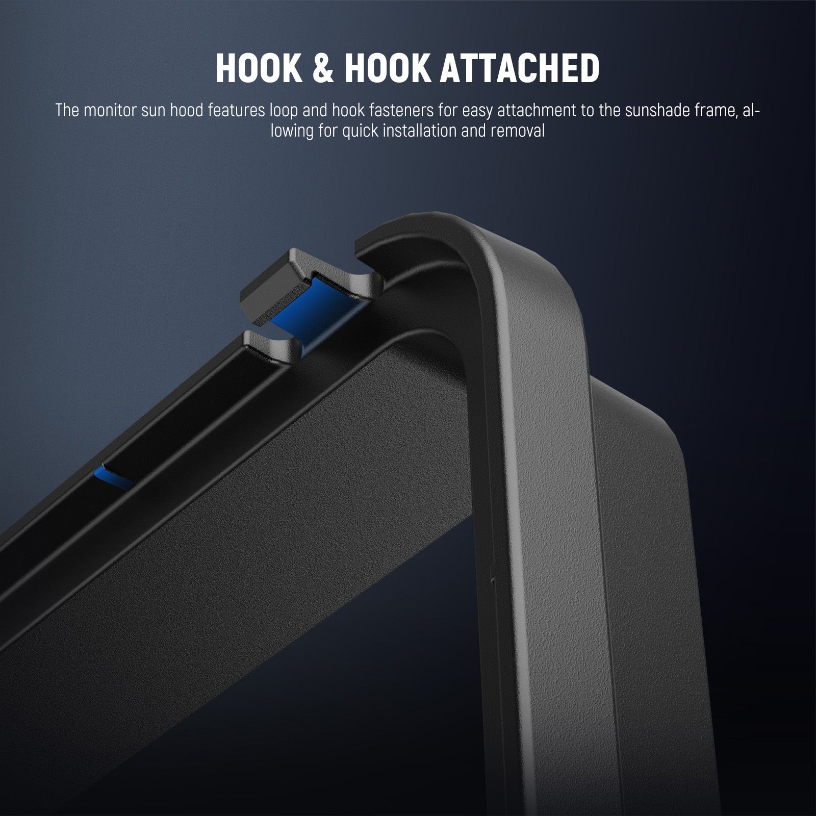 • Gancho y gancho adjuntos : el parasol del monitor cuenta con sujetadores de bucle y gancho para una fácil fijación al marco del parasol, lo que permite una rápida instalación y extracción.