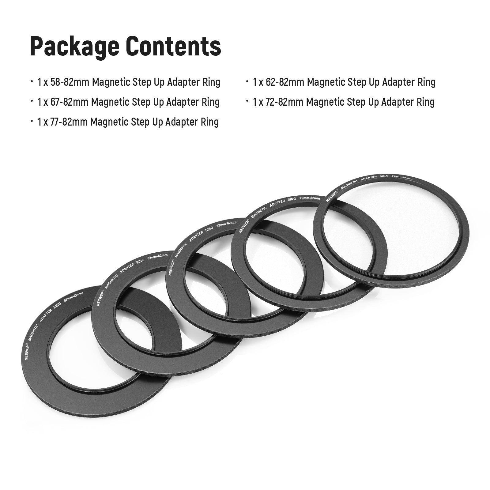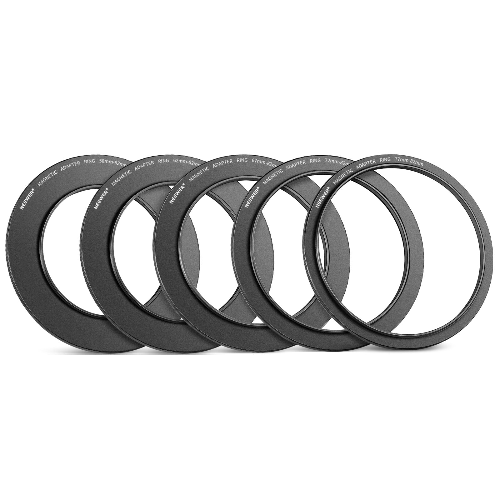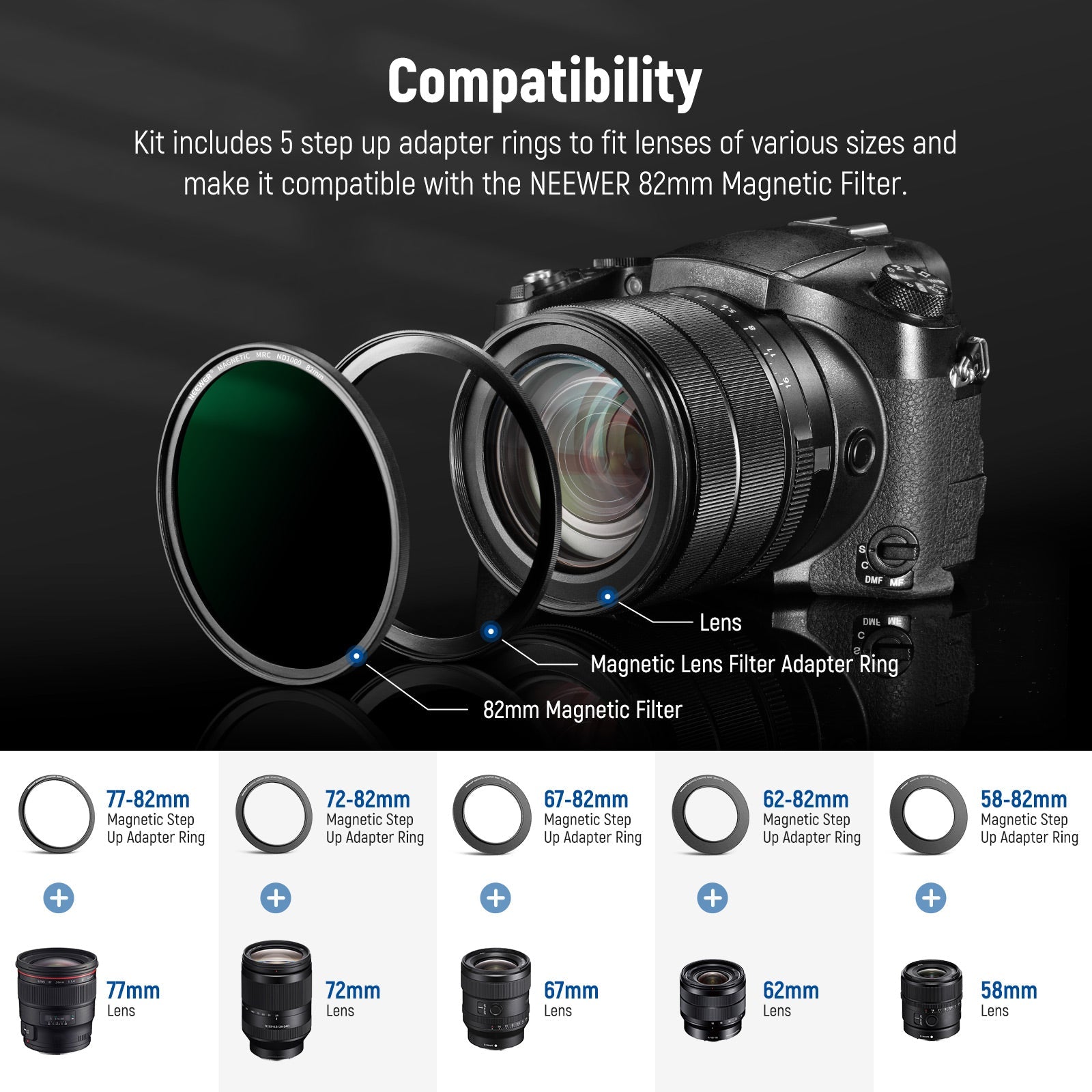 - Compatibilidad : obtenga este kit de anillo adaptador para poder usar la lente de su cámara de 77 mm, 72 mm, 67 mm, 62 mm y 58 mm con su filtro magnético de 82 mm.