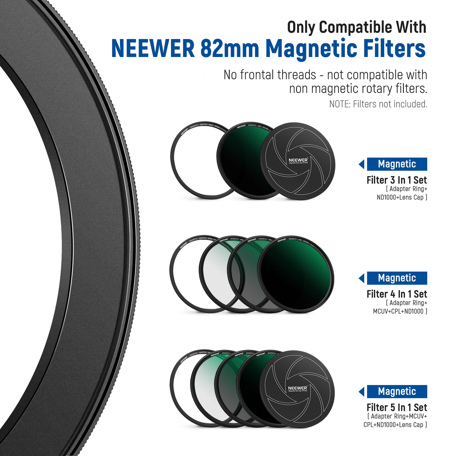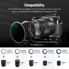 - Tenga en cuenta que el anillo adaptador SÓLO es compatible con los filtros magnéticos NEEWER Kase K&F de 82 mm. No tiene rosca frontal y NO es compatible con filtros de tornillo no magnéticos.