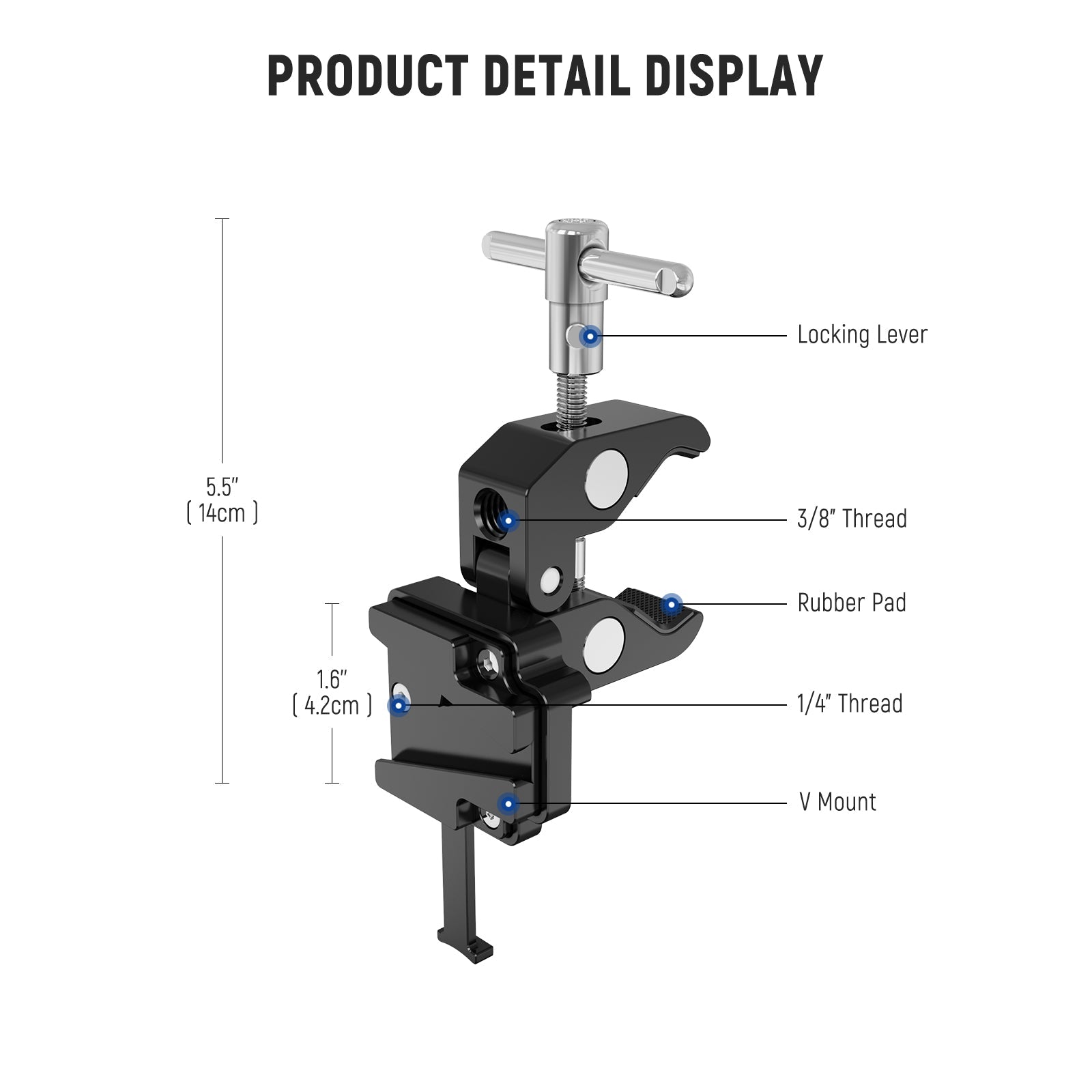 - Apertura de boca más amplia: con una apertura máxima de 2” (50 mm), la abrazadera en forma de V se puede asegurar en superficies planas y curvas o acoplar a una varilla, tubería y soporte de luz o soporte C con una resistencia increíble.