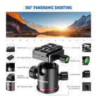 - Rótula giratoria de 360° para tomas panorámicas: Este trípode fotográfico incluye una rótula de 36 mm, más grande de lo habitual, que gira 360 grados para ofrecer ángulos de grabación flexibles y mantener la cámara estable. Sus dos perillas de bloqueo permiten un control preciso del movimiento de la cámara para tomas panorámicas. Los dos niveles de burbuja incluidos ayudan a mantener el horizonte recto.