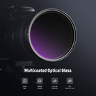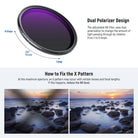 - Ajuste preciso de ND : gire el dial marcado para lograr valores ND precisos de ND2 a ND400 (de 1 a 9 pasos) para una exposición óptima. Nota: Los filtros ND variables funcionan según principios de polarización. Con la apertura máxima, ciertas lentes y distancias focales pueden causar un patrón X debido a la interacción del filtro.