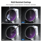 - Recubrimientos múltiples en ambos lados : el vidrio óptico con múltiples recubrimientos en ambos lados garantiza un contraste neutro y le permite tomar imágenes y videos con alta fidelidad de color. Los recubrimientos son repelentes al agua, a prueba de polvo, antihuellas y resistentes a rayones, fáciles de limpiar a diario.