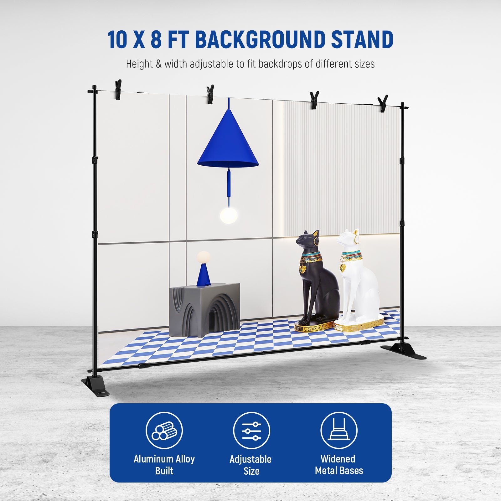 - Sistema de soporte de fondo para fotografía ultraestable : fabricado con una aleación de aluminio de primera calidad, este soporte para fondo de fotografía de 10 x 8 pies/3,1 x 2,4 m cuenta con dos bases metálicas ensanchadas para una estabilidad inigualable de hasta 11 lb/5 kg. También viene con barras transversales y postes de extensión retráctiles para tamaños y composiciones de telón de fondo más flexibles, y se puede empacar en la bolsa de transporte para facilitar su almacenamiento y transporte.
