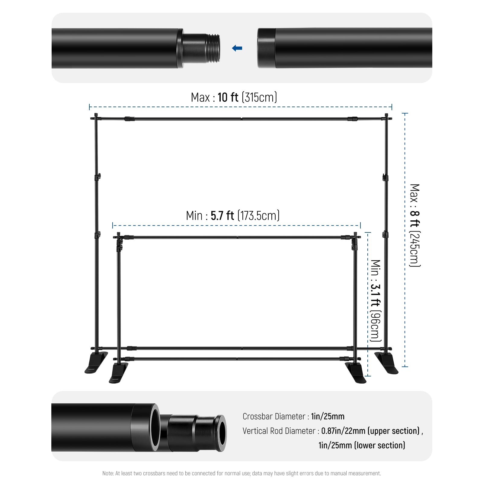 - Altura y ancho personalizables : con cuatro barras transversales desmontables (dos superiores, dos inferiores) y dos postes de extensión telescópicos, este soporte de telón de fondo ajustable ajusta fácilmente el ancho de 5,9 pies/180 cm a 9,8 pies/300 cm agregando o quitando barras transversales y configúrelo a su gusto. altura de 3,2 pies/98 cm a 8 pies/245 cm con un simple giro