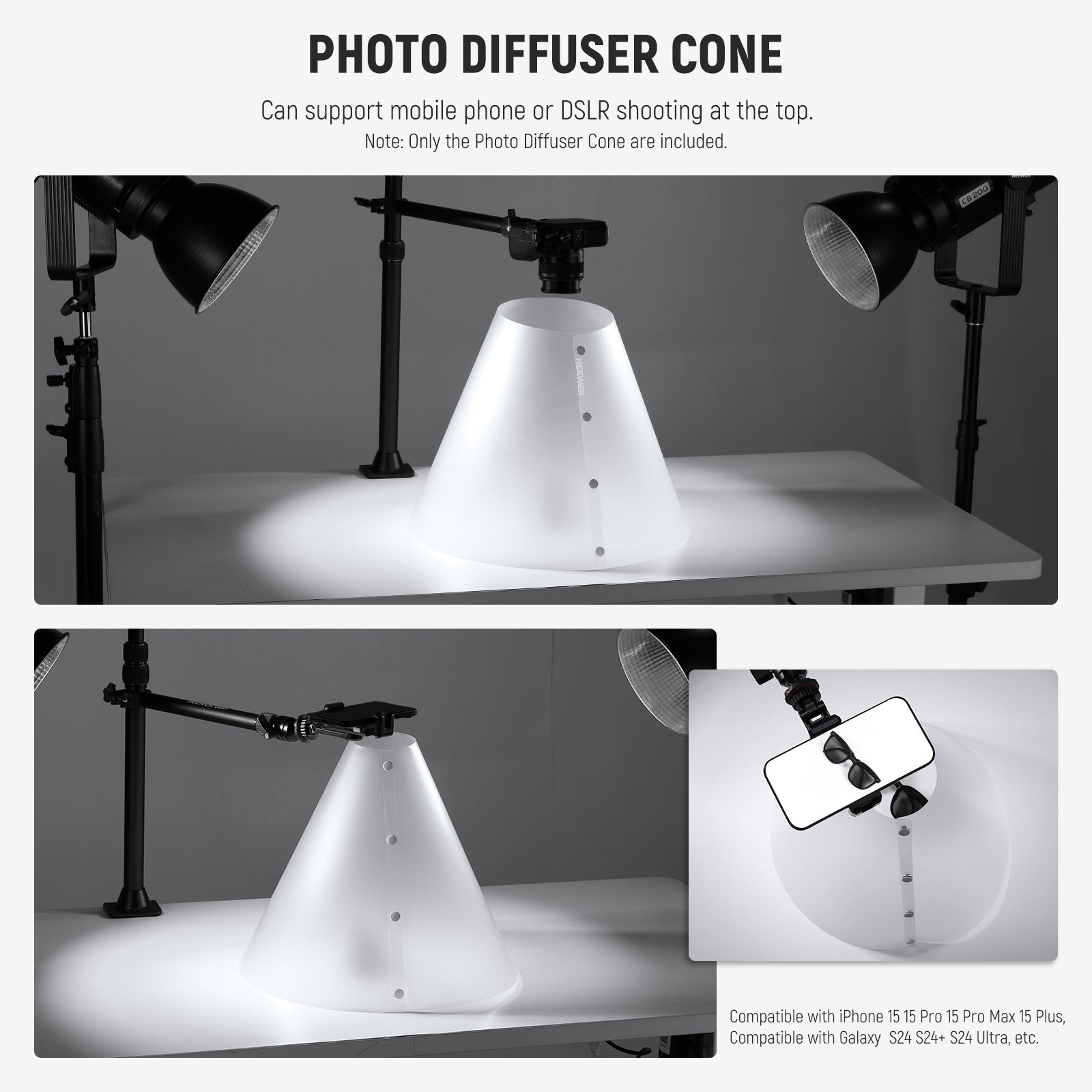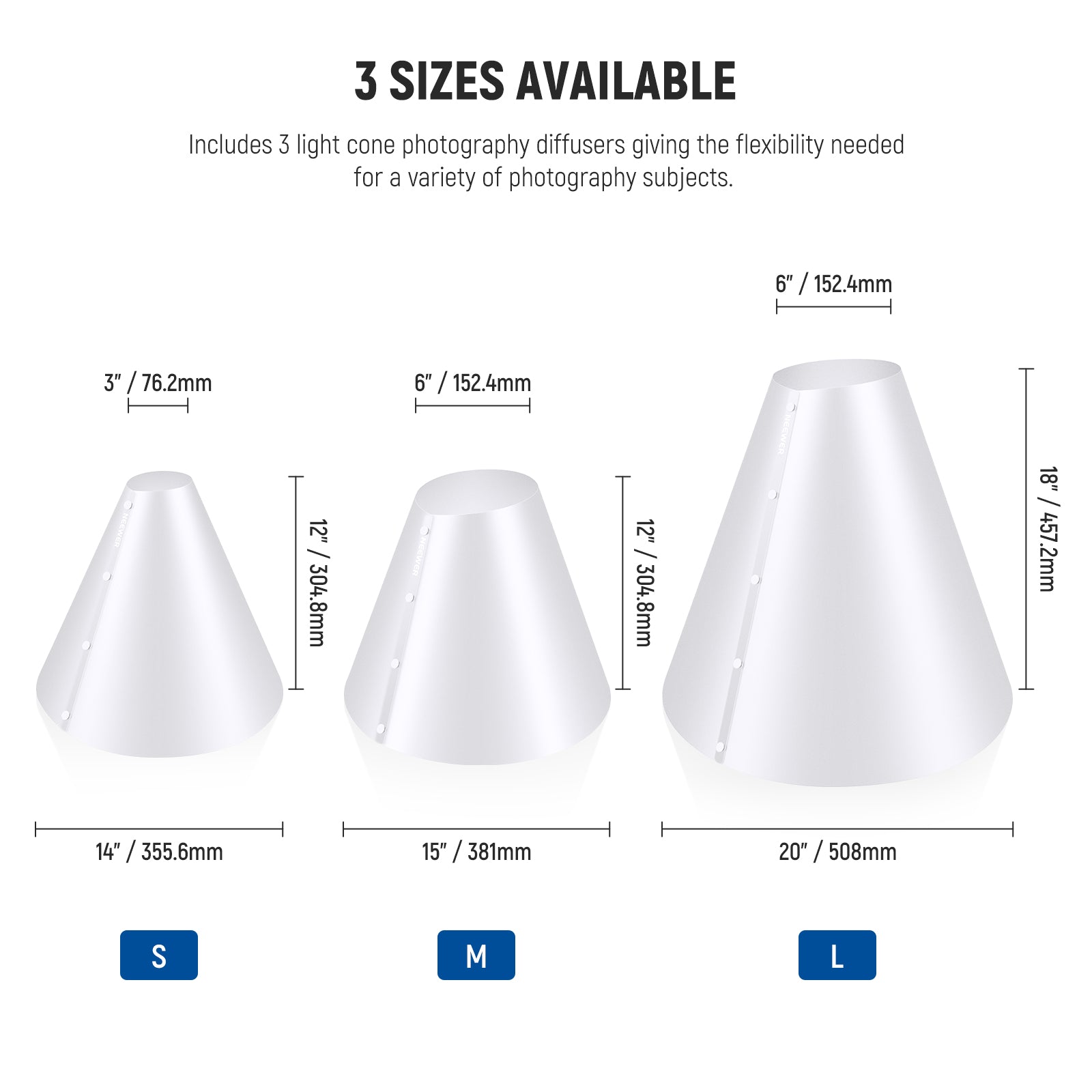 - 3 tamaños disponibles : 3 difusores de fotografía de cono de luz (14"/356 mm, 15"/381 mm, 20"/508 mm) brindan la flexibilidad necesaria para una variedad de temas fotográficos. Perfecto para capturar anillos, collares, joyas, relojes, lápices labiales y otros pequeños artículos personales reflectantes, también se aplica a productos reflectantes domésticos como grifos, duchas, teteras, tostadoras y secadores de cabello. Incluso el cono más pequeño es compatible con iPhone 15 para hacer una exhibición perfecta de sus productos.