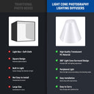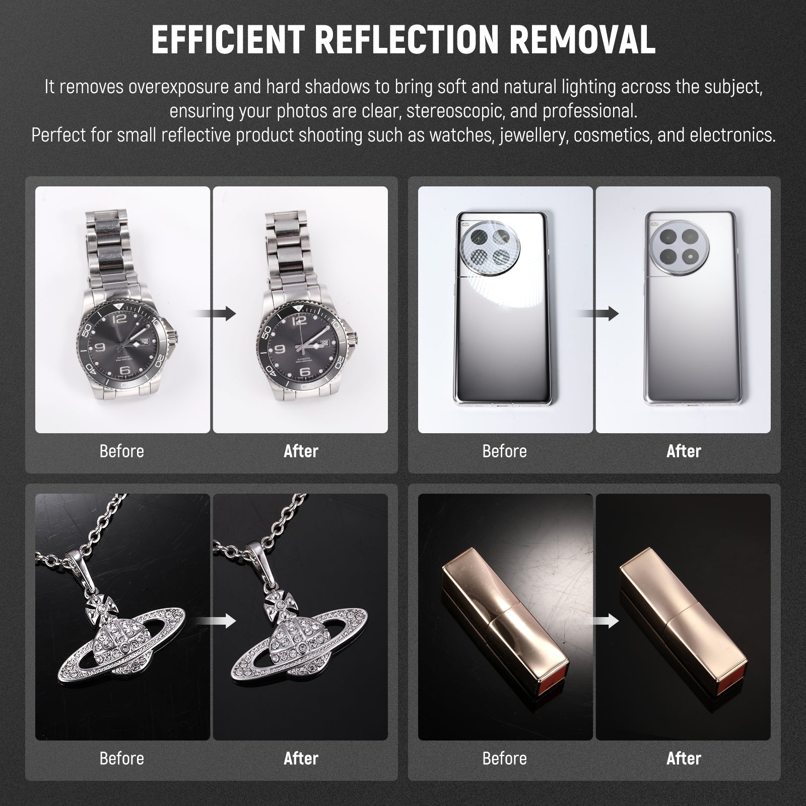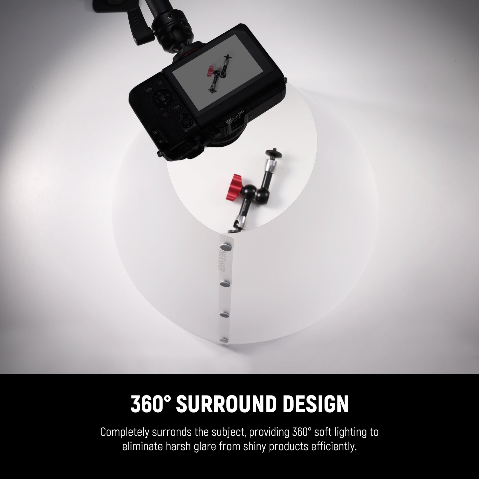 - Diseño envolvente de cono de luz de 360° : el cono de luz rodea al sujeto en 360° y proporciona un ajuste de iluminación suave de 360° para eliminar el deslumbramiento intenso de los productos brillantes de manera eficiente. La abertura superior inclinada permite tomar fotografías con facilidad y ofrece ángulos diversificados para capturar las mejores tomas de los sujetos.