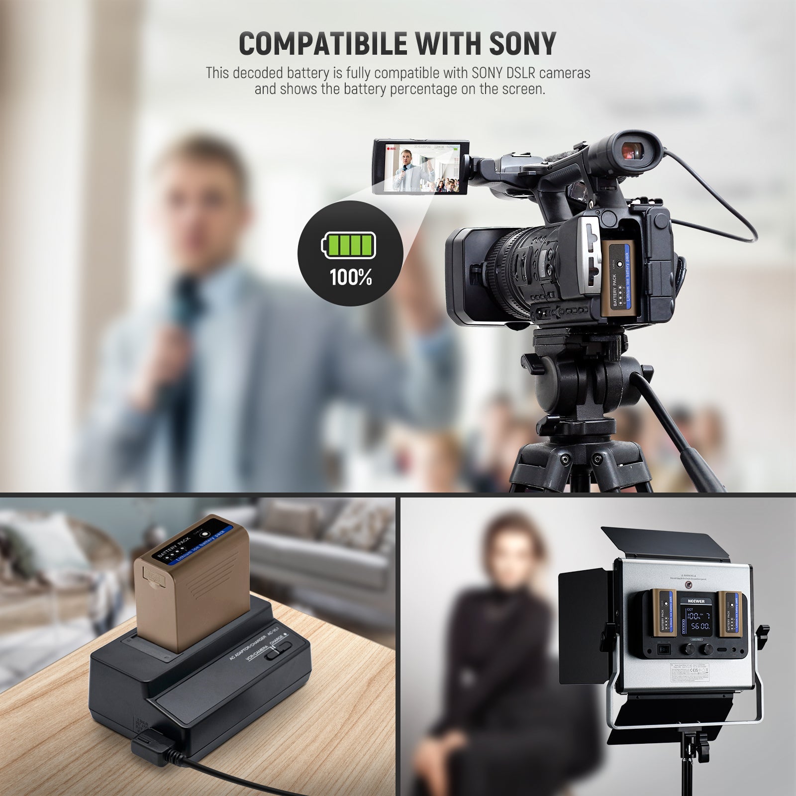 - Amplia compatibilidad : un reemplazo para todas las baterías de la serie NP-F, incluidas NP-F550, NP-F570, NP-F750, NP-F770, NP-F960, NP-F970, NP-F975. Compatible con cámaras y videocámaras Sony CCD-RV CCD-SC CCD-TR CCD-TRT CCD-TRV CVX DSR DCR GV HDR HVL HVR MPK MVC PBD PLM, paneles de luces LED, luces anulares y monitores de campo NEEWER