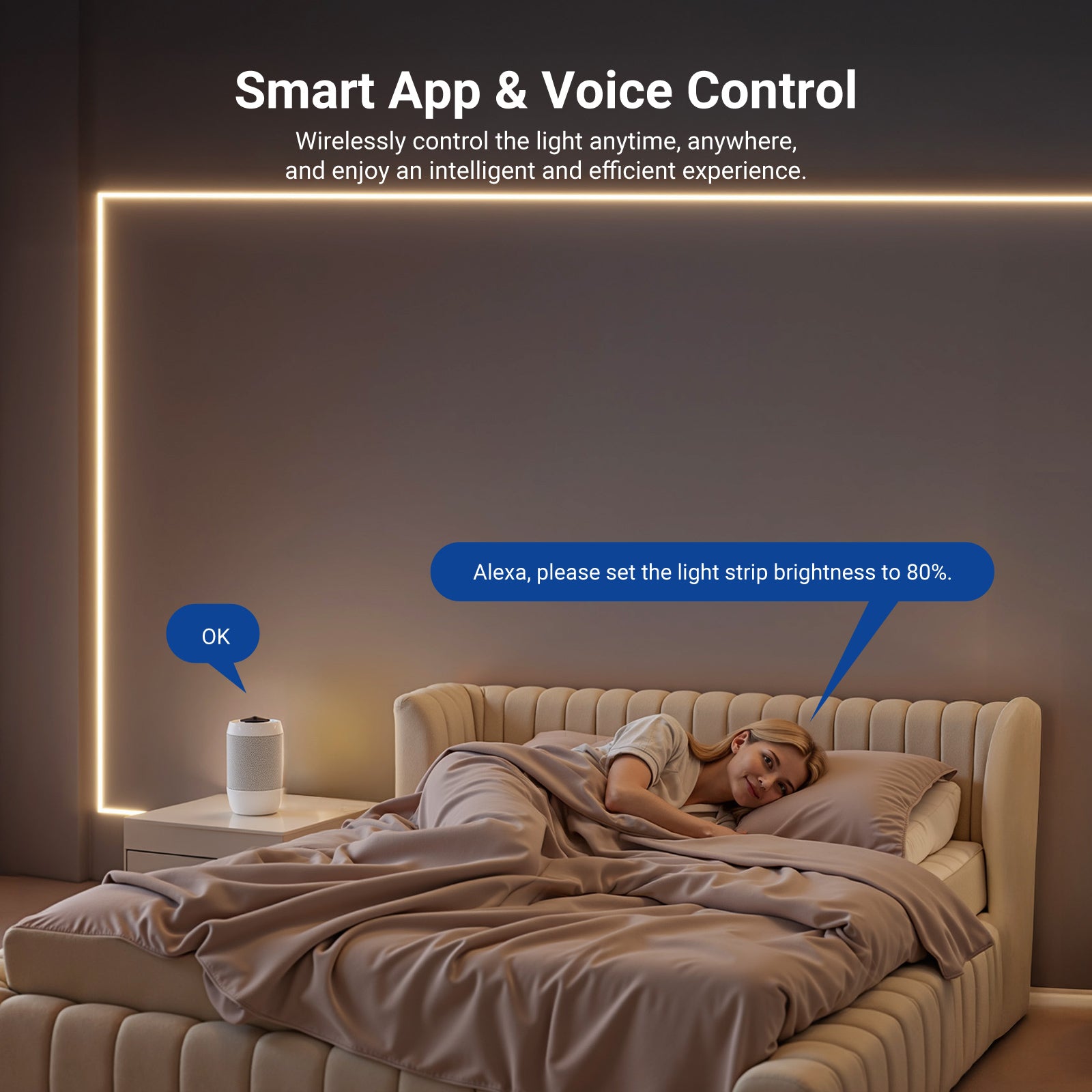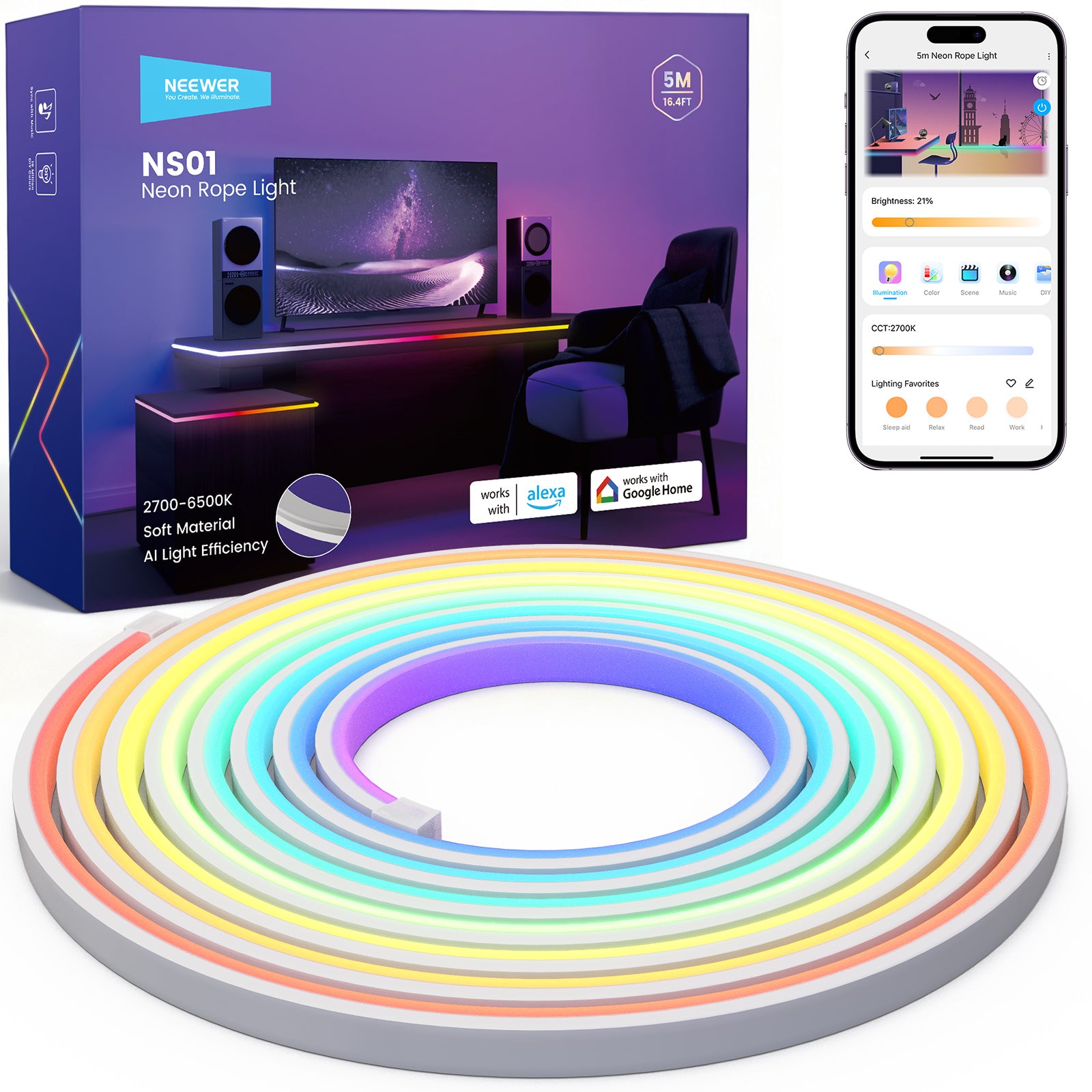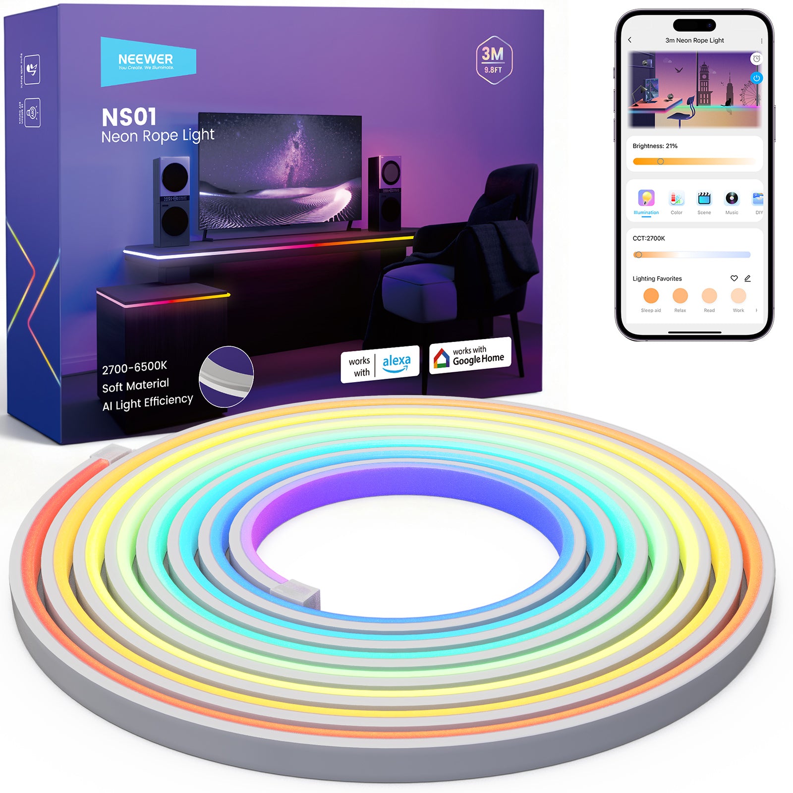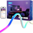 - LED RGB avanzados : Cada medidor incluye 84 LED RGB de alto rendimiento y 14 puntos de control. Las luces LED permiten el control por segmentos, lo que permite gestionar individualmente cada sección de la tira y crear transiciones fluidas, con flujo, ciclos o destellos en múltiples colores para crear efectos de iluminación suaves y dinámicos. Esta tira de neón también emite una luz blanca suave para la iluminación funcional diaria, ajustable de 2700K a 6500K.