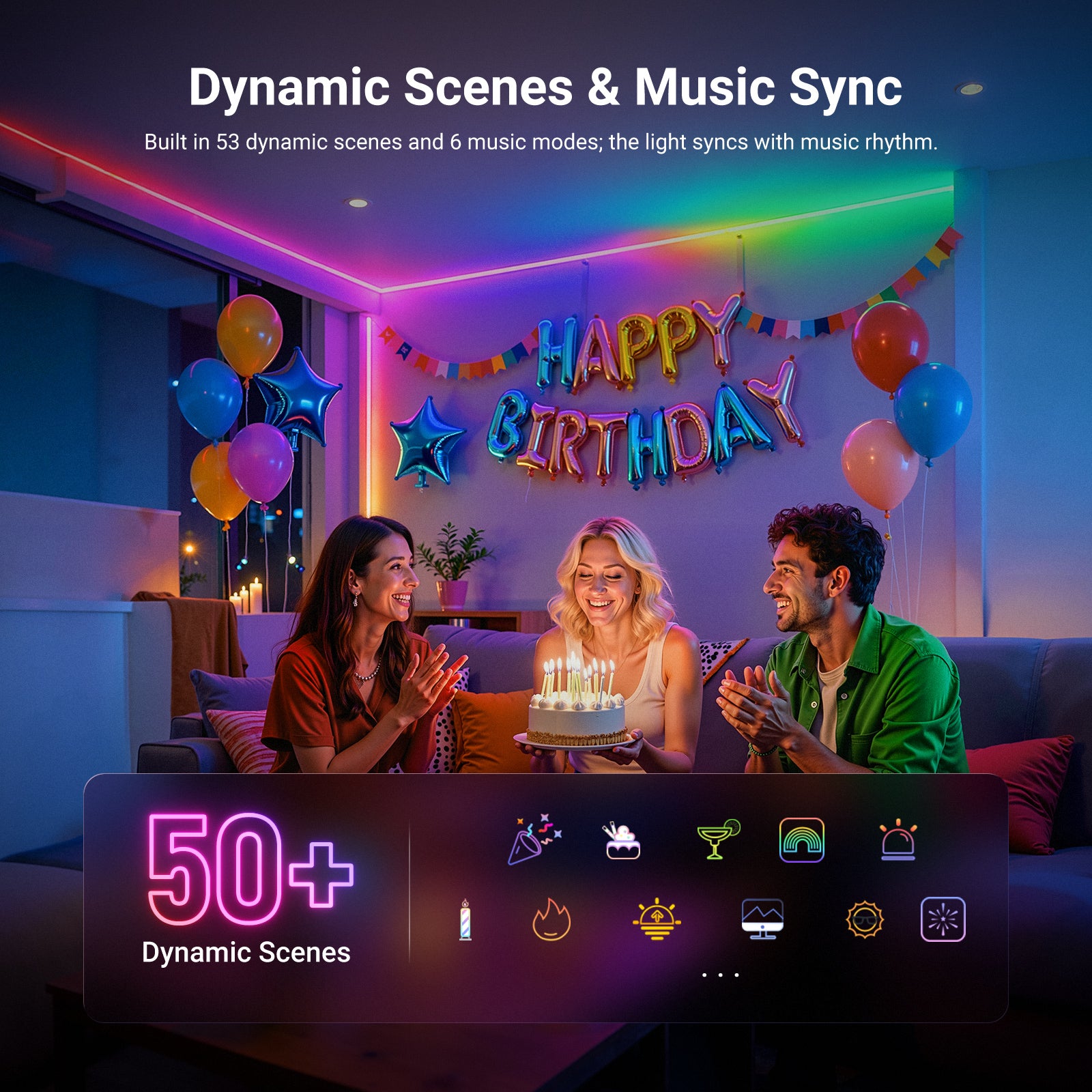 - Escenas dinámicas y sincronización musical : la tira de luces LED de neón ofrece más de 50 escenas predefinidas inspiradas en la vida cotidiana, las festividades, las emociones y la naturaleza, con actualizaciones continuas que añaden nuevos efectos de iluminación novedosos que se adaptan a tus necesidades. La caja de control incluida cuenta con un micrófono integrado que detecta la música en tiempo real, lo que permite que la tira de luz arcoíris cambie de color al ritmo de la música o los efectos de sonido del juego, creando fácilmente una atmósfera dinámica e inmersiva.