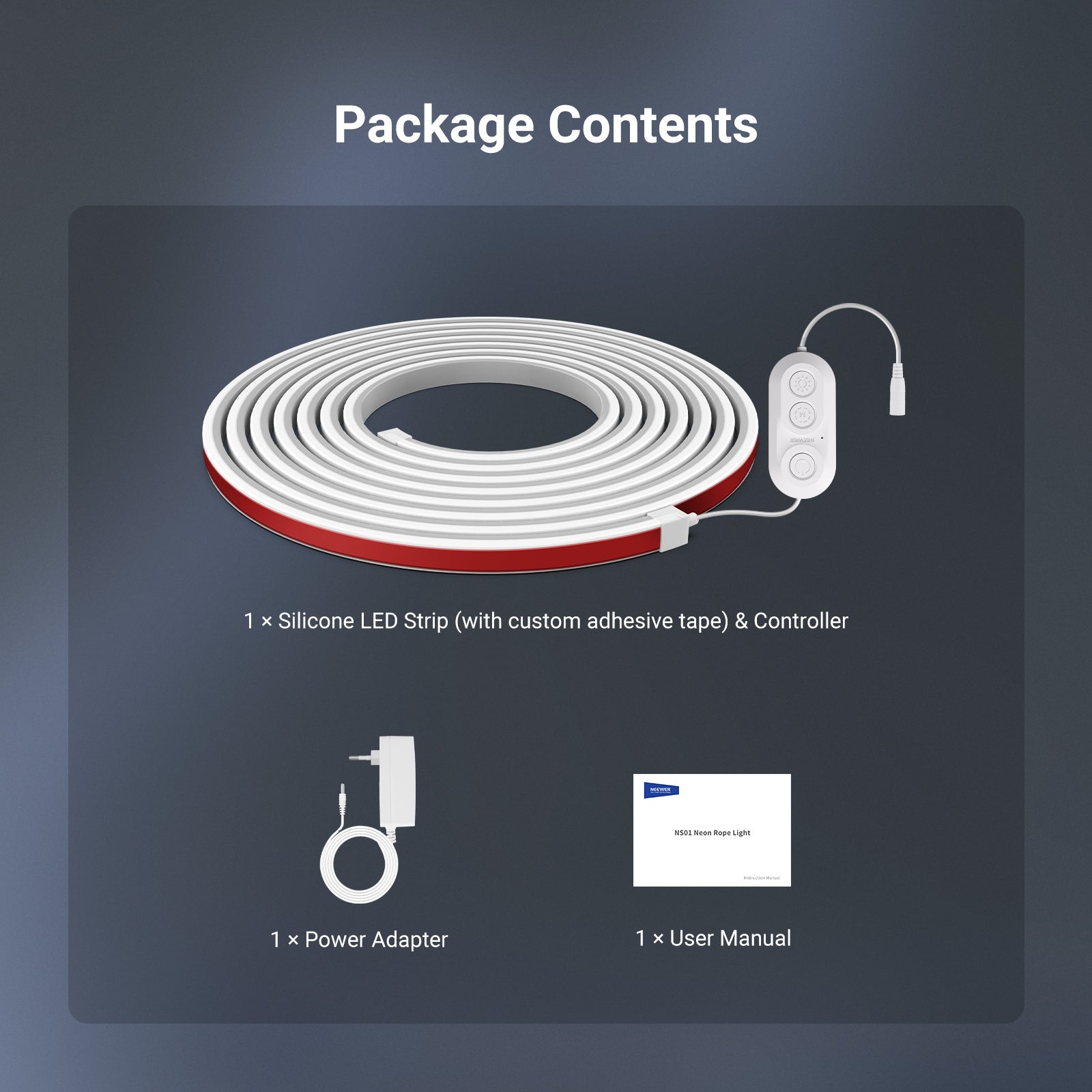 - Tira de luz de silicona brillante y flexible : La tira LED de neón NS01 está hecha de silicona pura impermeable, suave, flexible y fácil de doblar, lo que permite una fácil instalación en dormitorios, esquinas, aleros, paredes o dentro de armarios. Su diseño de emisión frontal, con 252 LED (84 LED/m) integrados en la tira de silicona de alta transmisión, proporciona una luz brillante, natural y difusa para un ambiente acogedor y de ensueño. Nota: El controlador y el adaptador de corriente NO son impermeables.