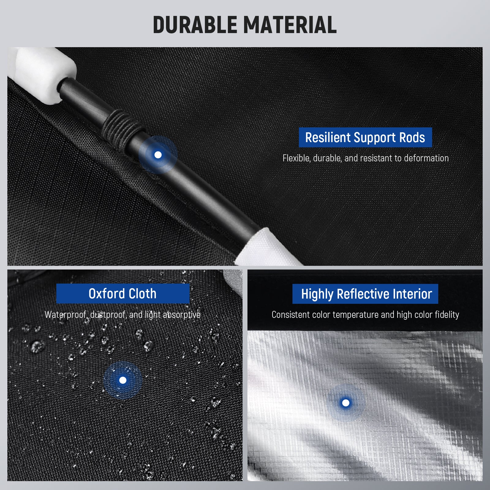 - Softbox pequeño y cuadrado portátil : este softbox relativamente pequeño de 15,7"x15,7"/40 x 40 cm cuenta con un revestimiento plateado brillante que amplía y difunde la salida al mismo tiempo que conserva el índice de reproducción cromática (CRI) y la temperatura del color neutros. La distribución uniforme de la luz puede minimizar las imperfecciones y las sombras, suavizar la piel y definir las estructuras faciales.