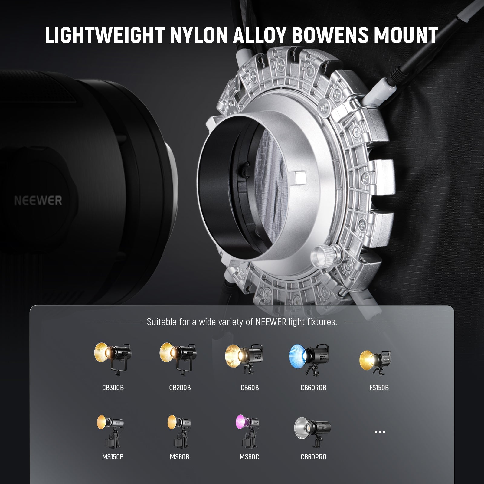 - Adjunte a través del soporte Bowens : este difusor de caja de luz para fotografía con soporte Bowens estándar es compatible con varios equipos de iluminación de estudio, flashes estroboscópicos, flashes monoluces y luces de video LED COB de salida continua, incluido NEEWER Vision 4 Q4 CB300B CB200B FS150B CB100C MS150B MS60C MS60B CB60 RGB S101- 300W/400W PRO, compatible con Aputure 300c 200X 60D 60x S, compatible con Godox SL60w, compatible con SmallRig RC 120D RC 120B, etc.