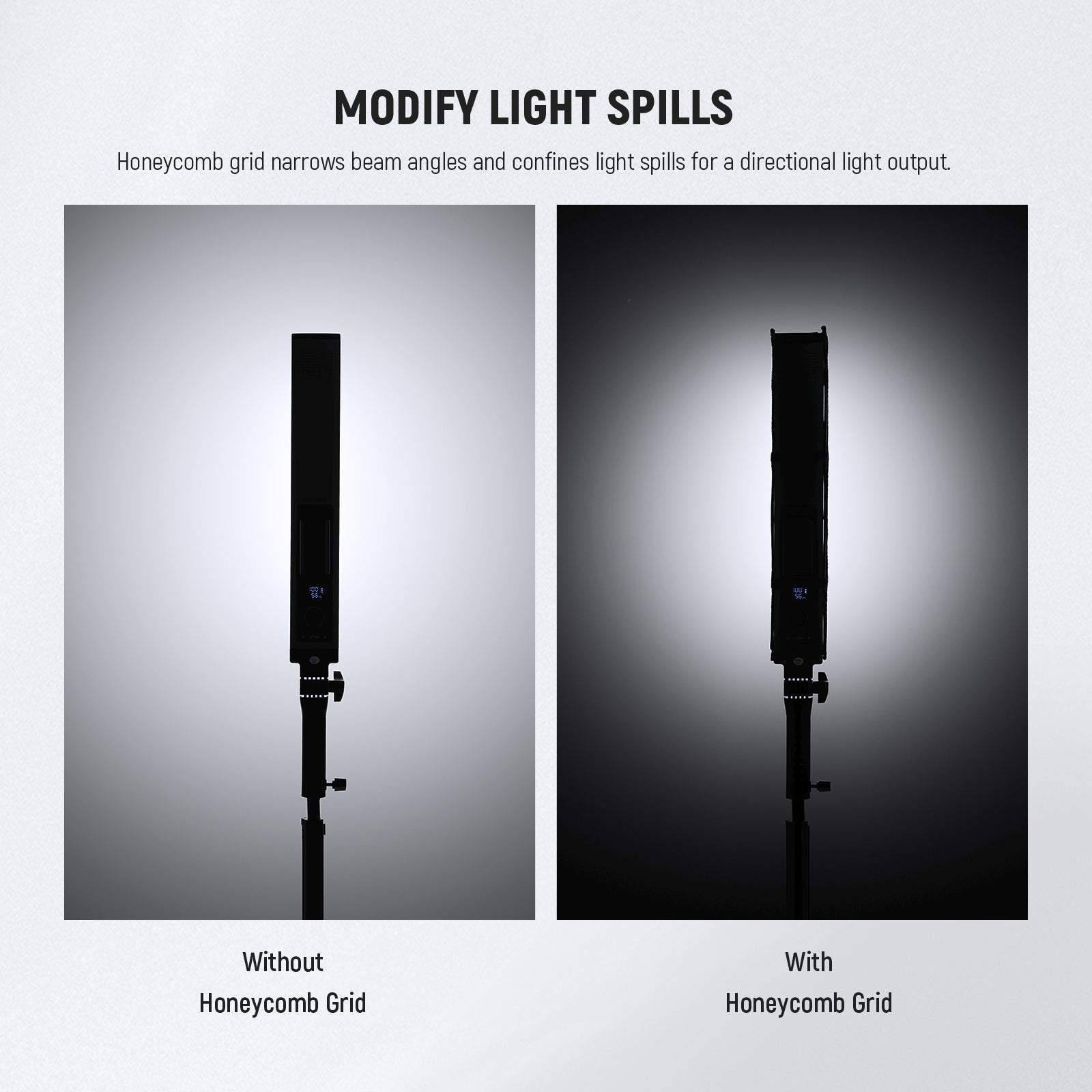 - Manipule las direcciones de la luz : la rejilla de la caja de huevos puede estrechar los ángulos del haz, limitar los derrames de luz y generar un contraste dramático en imágenes y videos.