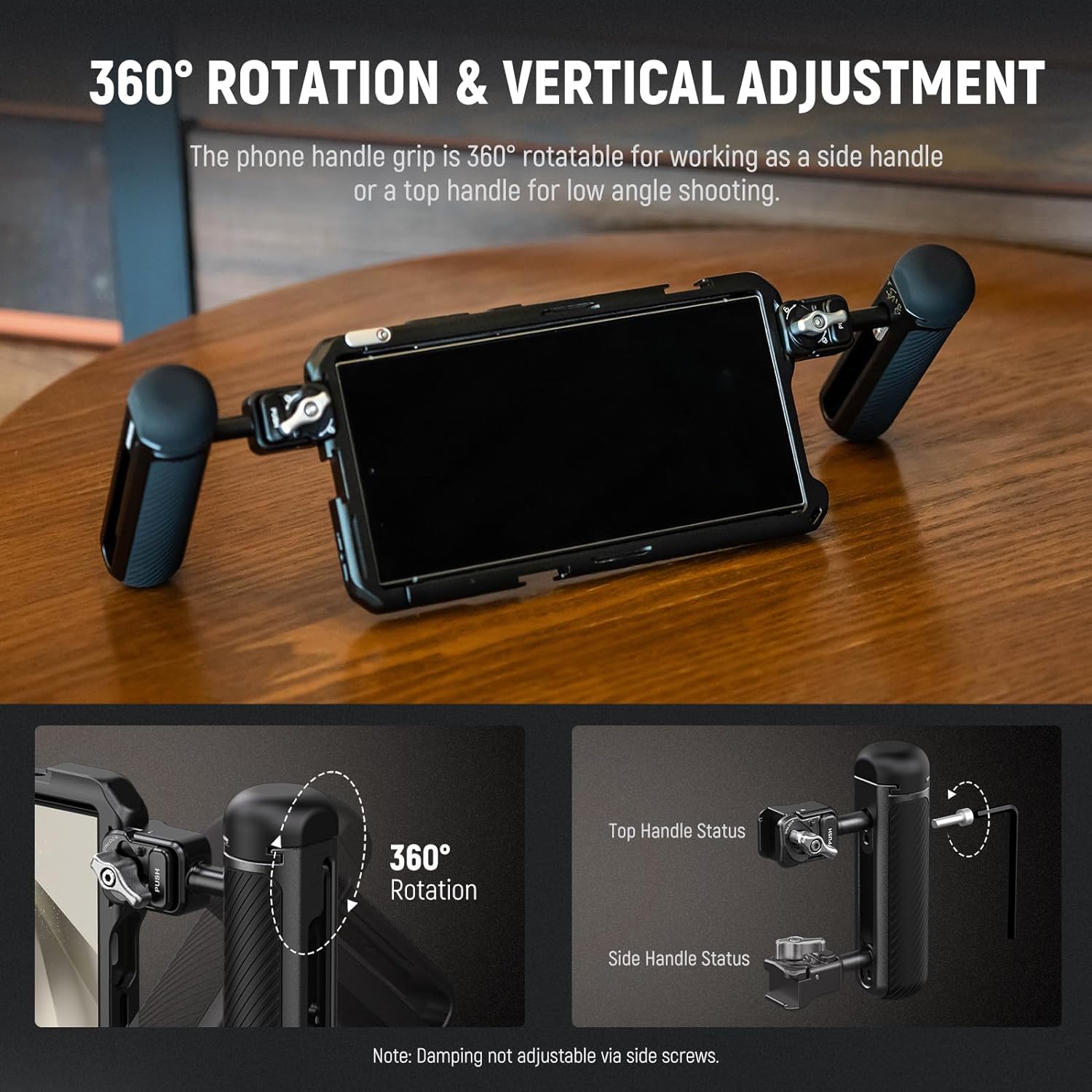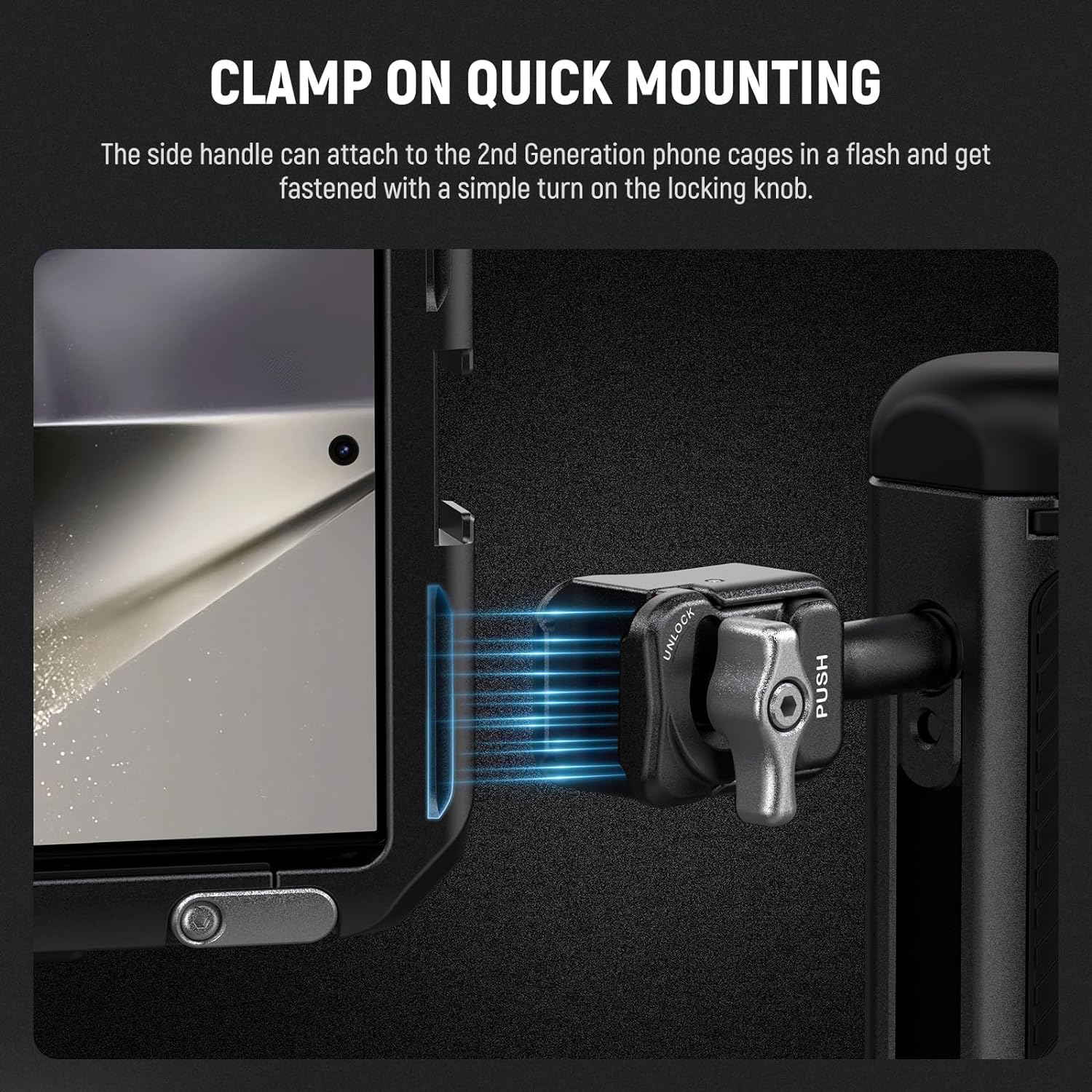 - Montaje rápido con abrazadera : con una abrazadera de liberación rápida de nuevo diseño, el asa lateral se puede conectar al soporte para teléfono de segunda generación en un instante y se fija con un simple giro de la perilla de bloqueo. Este sencillo proceso de montaje es perfecto para grabación de videos al aire libre, realización de películas, vlogs, transmisión en vivo, fotografía móvil y otras creaciones de contenido donde el tiempo es un bien escaso.