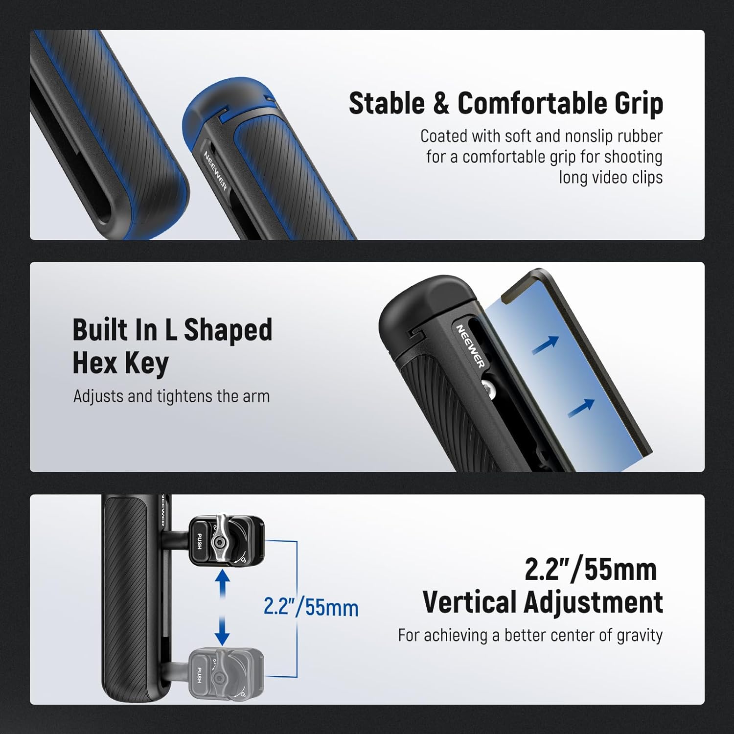 - Agarre estable y cómodo : recubierto con goma suave y antideslizante, el mango lateral de liberación rápida proporciona un agarre cómodo y firme para grabar videos estables y prolongados.
