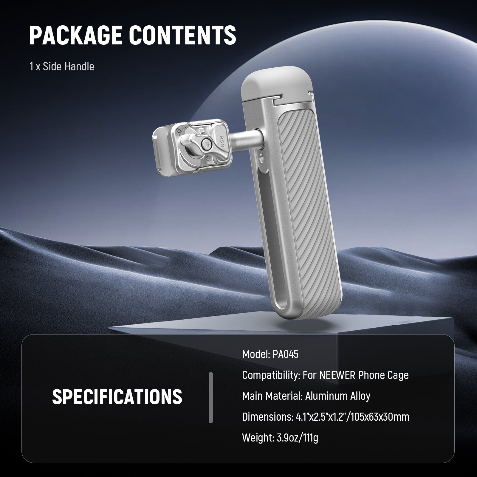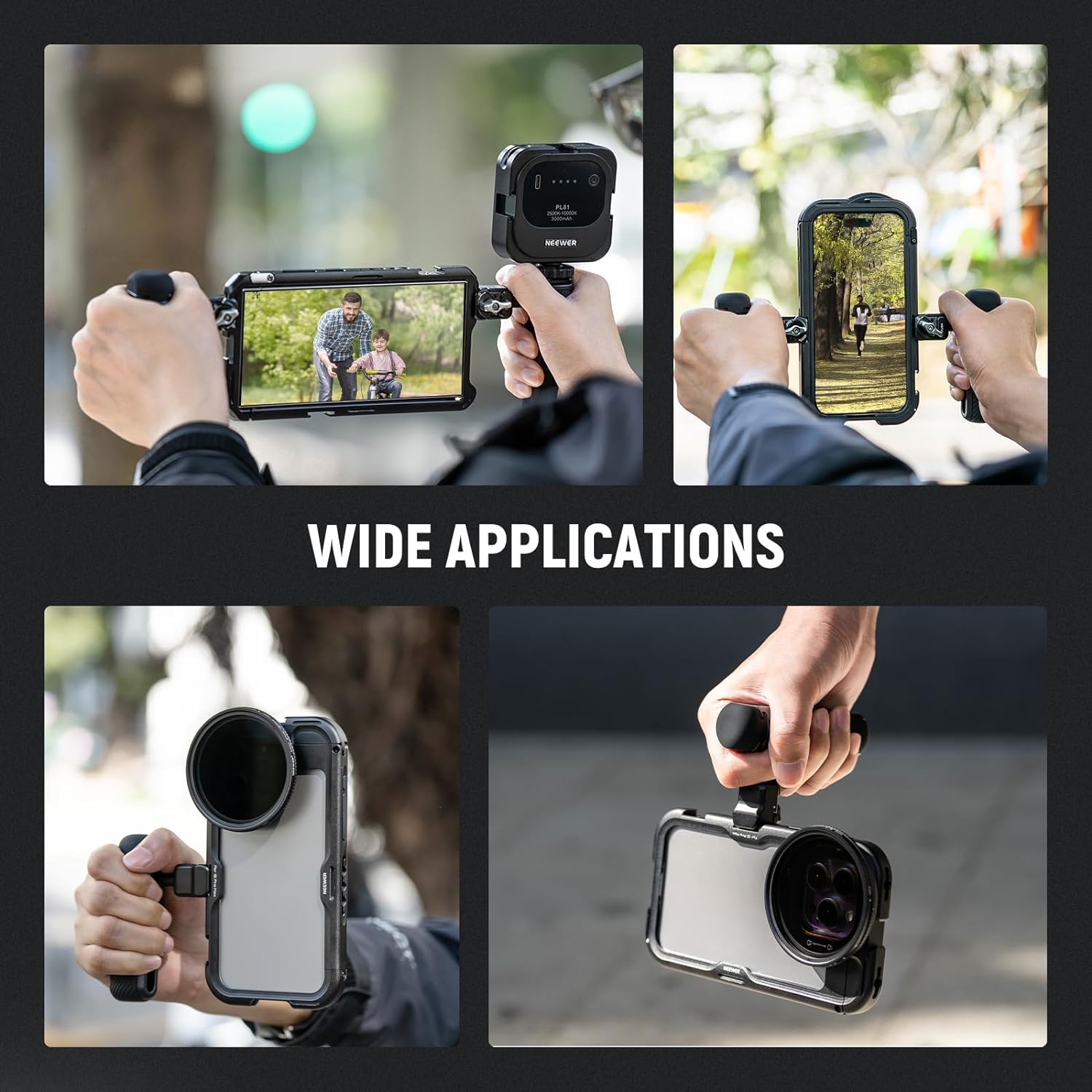 Para jaulas de teléfono con ranuras de liberación rápida : esta empuñadura lateral está diseñada específicamente para jaulas de teléfono NEEWER con ranuras de liberación rápida dedicadas, incluidas PA073/PA074 para iPhone 16 Pro/Pro Max, PA043/PA044 para iPhone 15 Pro/Pro Max y PA042 para Samsung Galaxy S24 Ultra