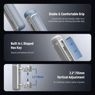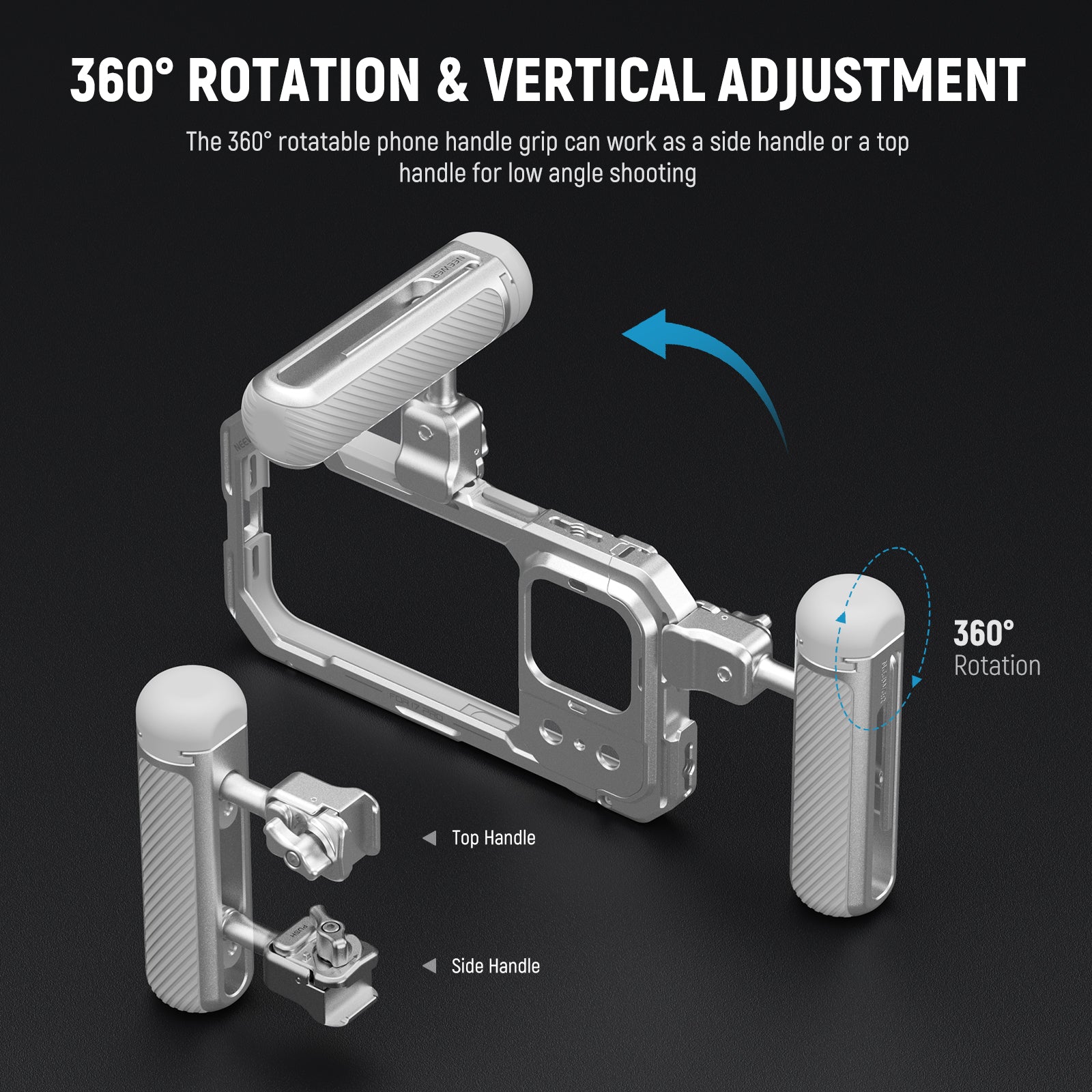 - Rotación de 360° y ajuste vertical : la empuñadura del teléfono se puede girar 360° para funcionar como empuñadura lateral o superior para tomas desde ángulos bajos. También admite un ajuste vertical de 2,2"/55 mm para lograr un mejor centro de gravedad.