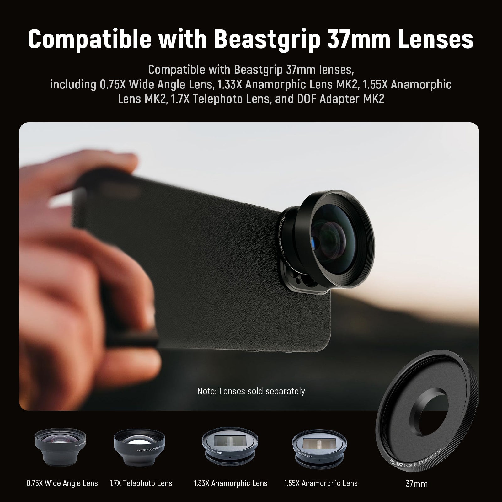 - Compatible con lentes Beastgrip de 37 mm : compatible con lentes Beastgrip de 37 mm, incluidas la lente gran angular de 0,75X, la lente anamórfica MK2 de 1,33X, la lente anamórfica MK2 de 1,55X, la lente telefoto de 1,7X y el adaptador DOF MK2