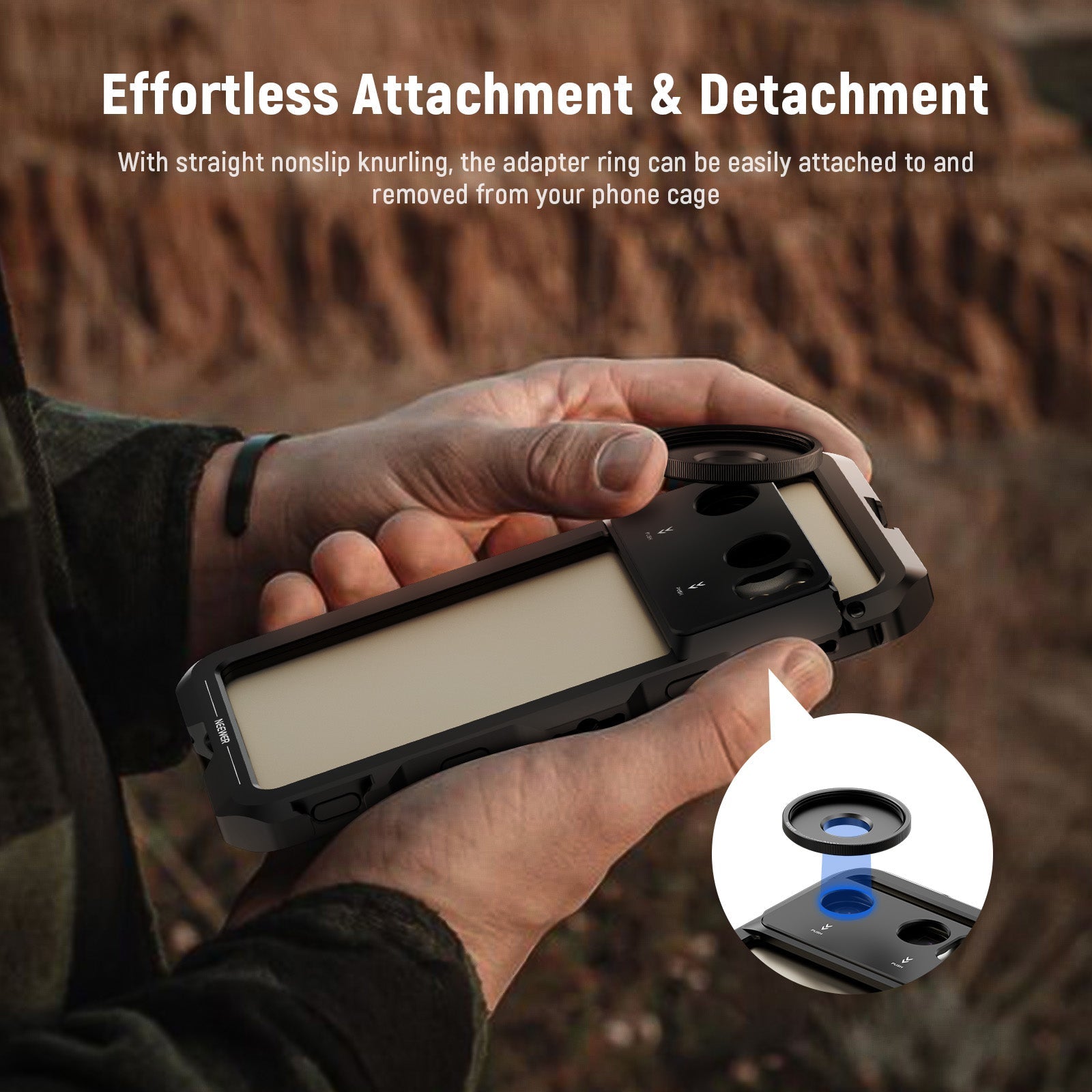 - Fijación y desmontaje sin esfuerzo : con moleteado recto antideslizante, el anillo adaptador se puede colocar y quitar fácilmente de la carcasa del teléfono.