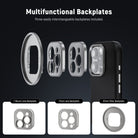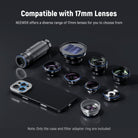 - Placa posterior para lentes de 17 mm : conecta lentes de teléfono de 17 mm a la cámara principal y a la cámara con telefoto, como macro de 105 mm, macro de 10x, ojo de pez de 8 mm, microscopio de 45x con luz LED, telefoto de 7x, telefoto de 60 mm, gran angular de 18 mm, anamórfico azul de 1,55x (los lentes se venden por separado)