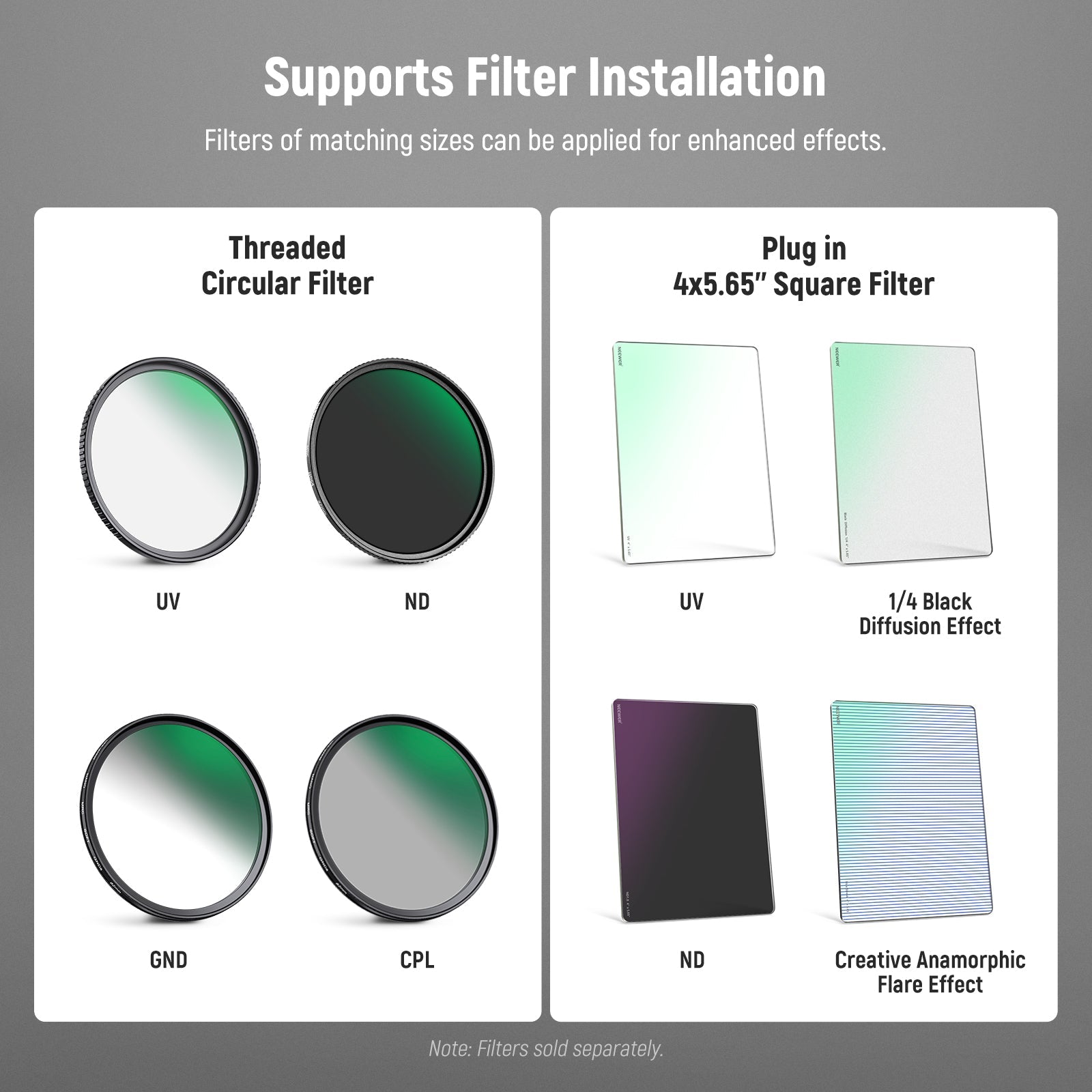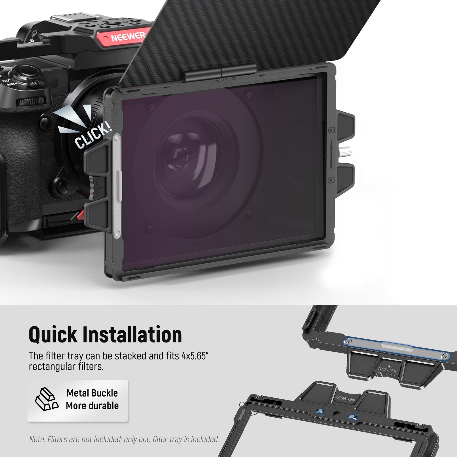 - Bandeja de filtro estándar de 4" x 5,65" : la bandeja de filtro incluida se adapta a filtros rectangulares de 4"x5,65" (no incluidos). Los filtros (se venden por separado) se pueden asegurar con las perillas roscadas de la bandeja del filtro y protegerse con almohadillas de goma. Compatible con K&F Compatible con NISI Compatible con TIFFEN Compatible con Tilta Compatible con filtros cuadrados SmallRig para filmación