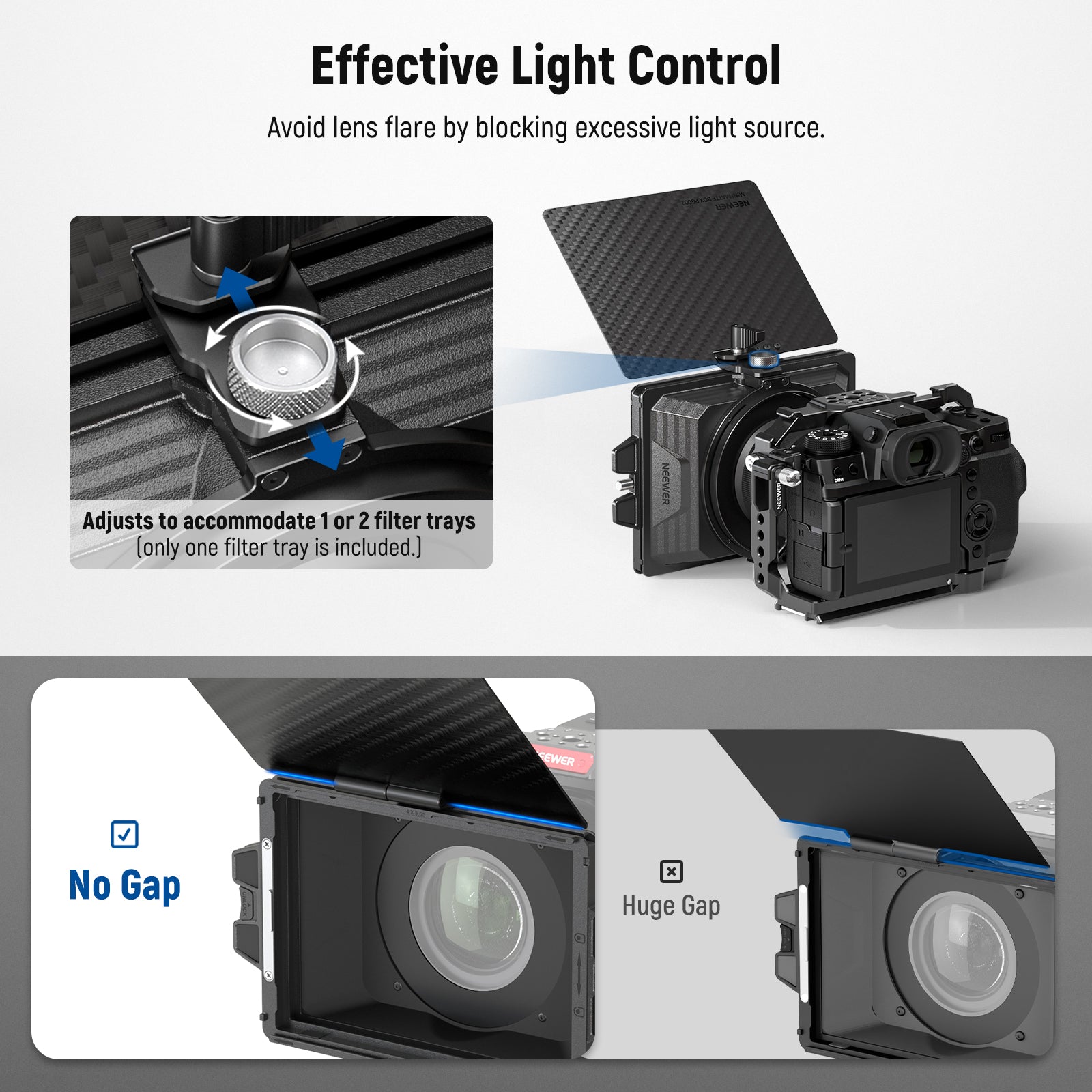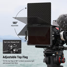 - Bandera superior ajustable de 180° : inclina la bandera superior a 180° para bloquear el exceso de luz y evitar el destello de la lente. Doble la bandera hacia abajo para cubrir el filtro frontal y proteger la lente. El bloqueo de la bandera superior asegura firmemente la bandera en su lugar, y el tornillo de mariposa le permite ajustar la bandera hacia adelante y hacia atrás para sujetar la bandeja del filtro para un bloqueo perfecto de la luz.