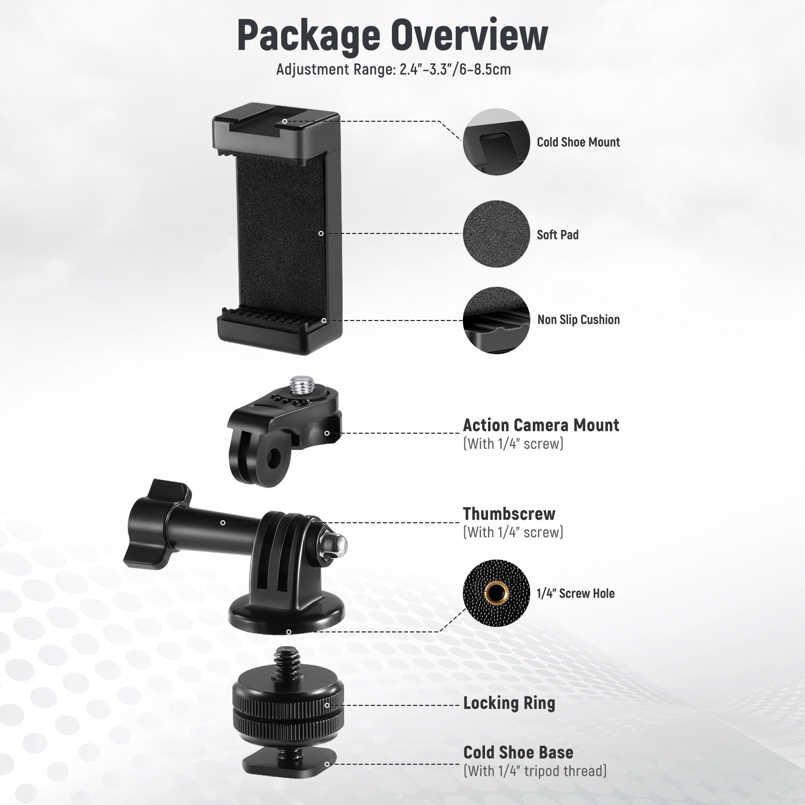 - El paquete contiene: 1 soporte para zapata (con rosca para trípode de 1/4"), 1 soporte para cámara de acción (con conexión para trípode de 1/4"), 1 tornillo mariposa, 1 adaptador de montaje para cámara de acción (con rosca para trípode de 1/4"), 1x Soporte universal para teléfono (con conexión para trípode de 1/4")