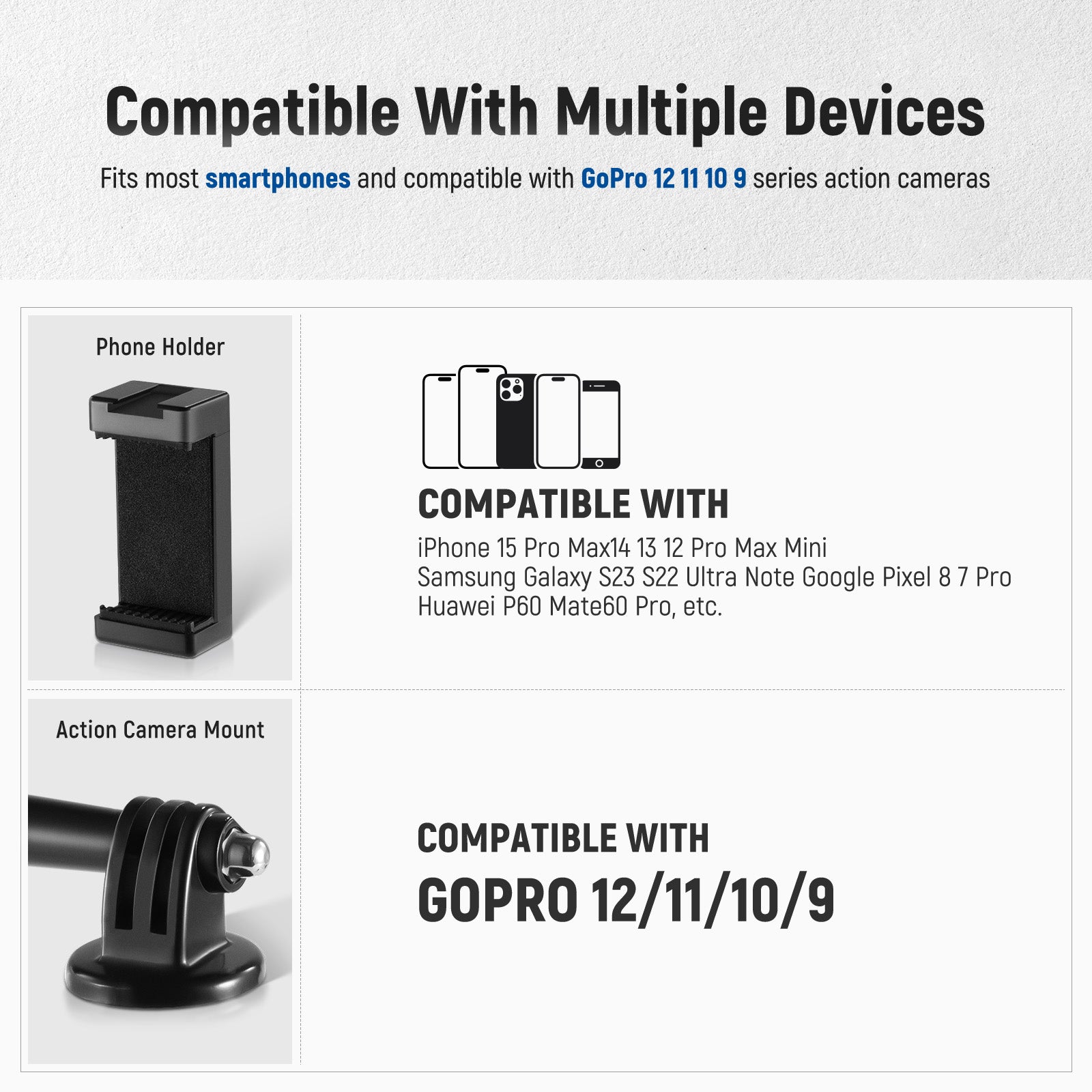 - Compatible con iPhone 12 11 Pro Max X XR Samsung Huawei GoPro Hero 11 10 9 8 7 6 5 DJI OSMO Action y otros dispositivos con un ancho de 2,4-3,3 pulgadas (6-8,5 cm)