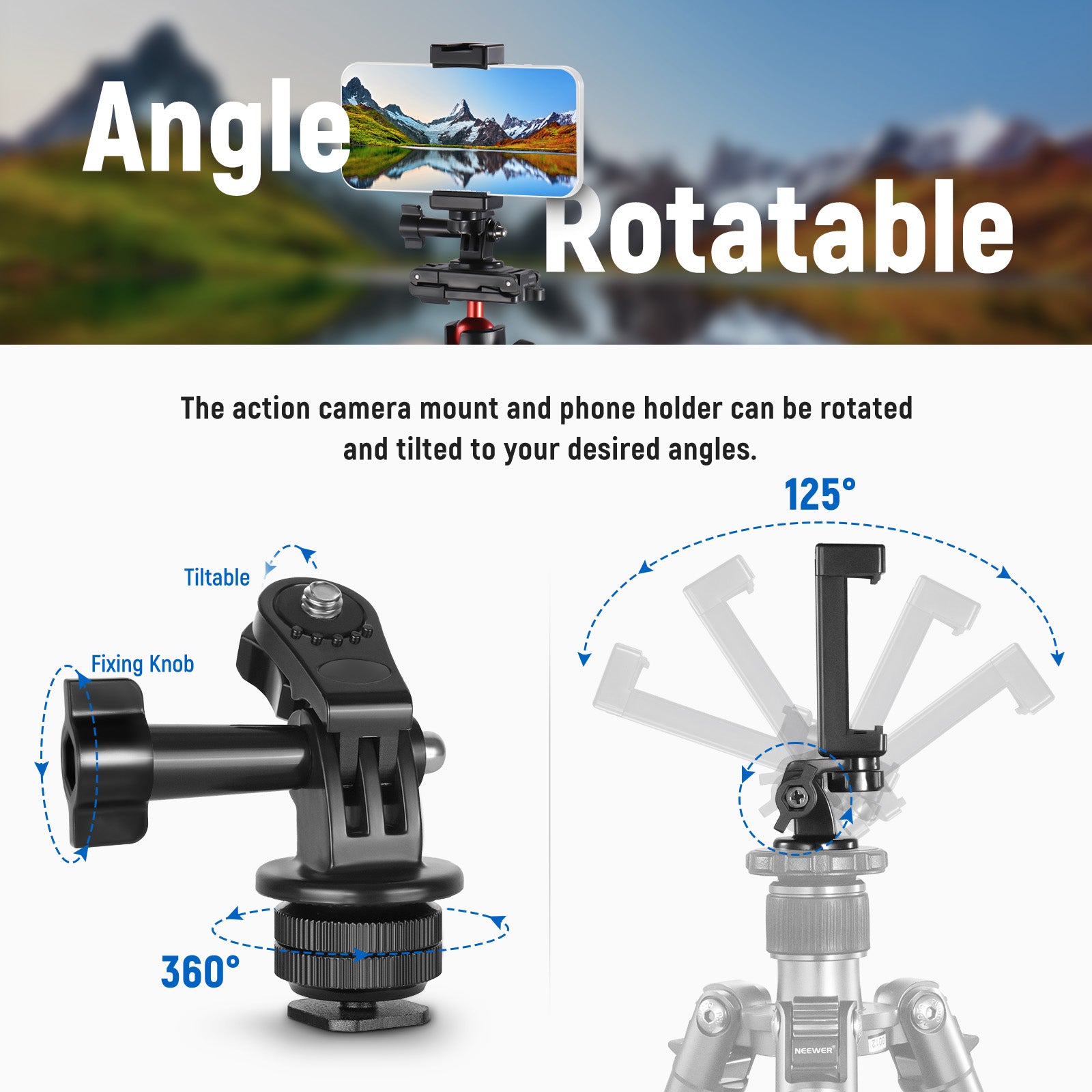 - El soporte para cámara de acción con rosca de 1/4" y soporte para teléfono se puede instalar en un trípode, y ambos se pueden girar e inclinar hasta los ángulos deseados.