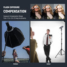 - Rendimiento optimizado : potente flash con alto GN58 (ISO100, @35 mm), 200 W de potencia ajustable en 8 pasos de 1/128 a 1/1 y duración del flash de tan solo 1/15380 s, la batería de 14,4 V y 3200 mAh ofrece 500 flash completos. La potencia parpadea con un reciclaje rápido de 0,01 a 1,8 segundos.