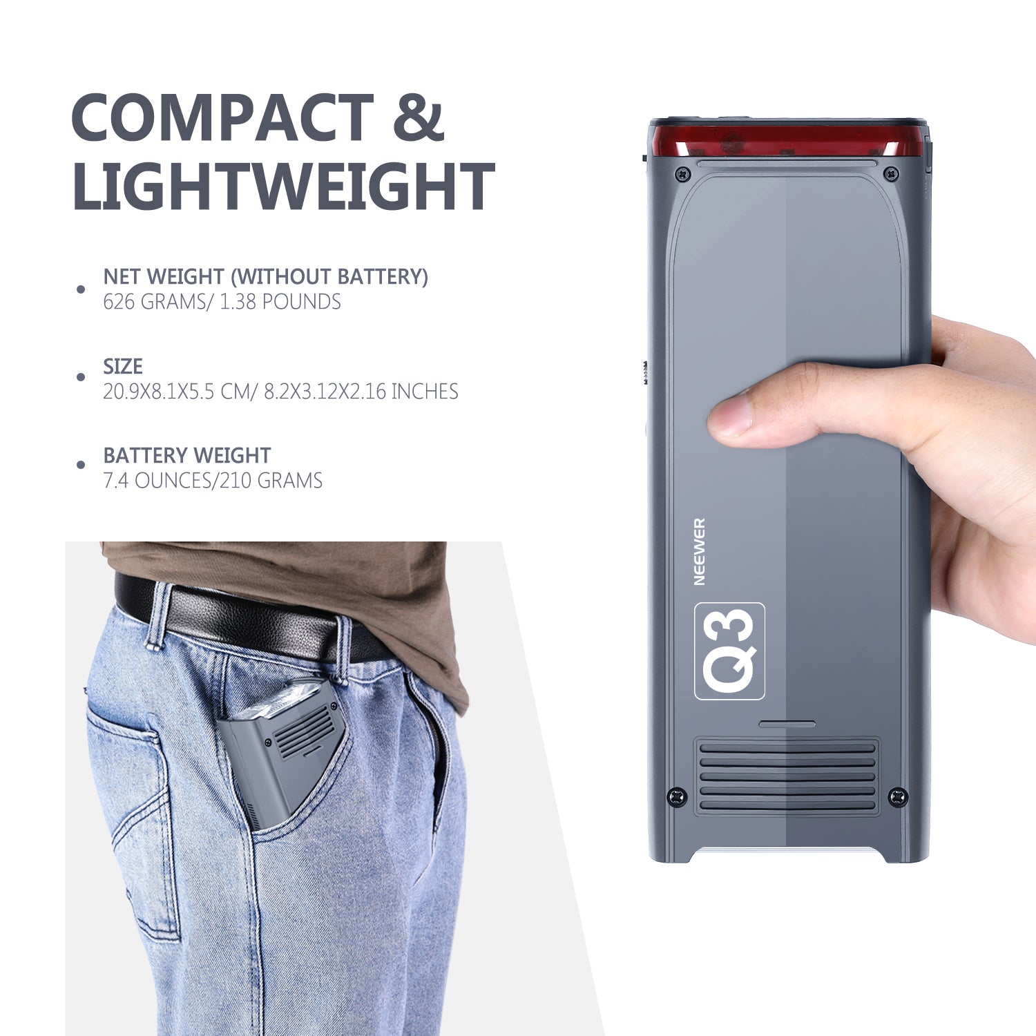 - FLASH PORTÁTIL: NEEWER Q3 ofrece la posibilidad de ser portátil, lo que significa que realmente puede llevar el flash en su bolsillo. La potencia del flash es de hasta 200 W. Es muy portátil para aquellos que necesitan llevar el flash a todas partes y tomar fotografías. Es por eso que el Q3 se llama "flash de bolsillo".