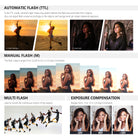 - Modo de sincronización: sincronización de alta velocidad (hasta 1/8000 segundos), sincronización de primera cortina y sincronización de segunda cortina