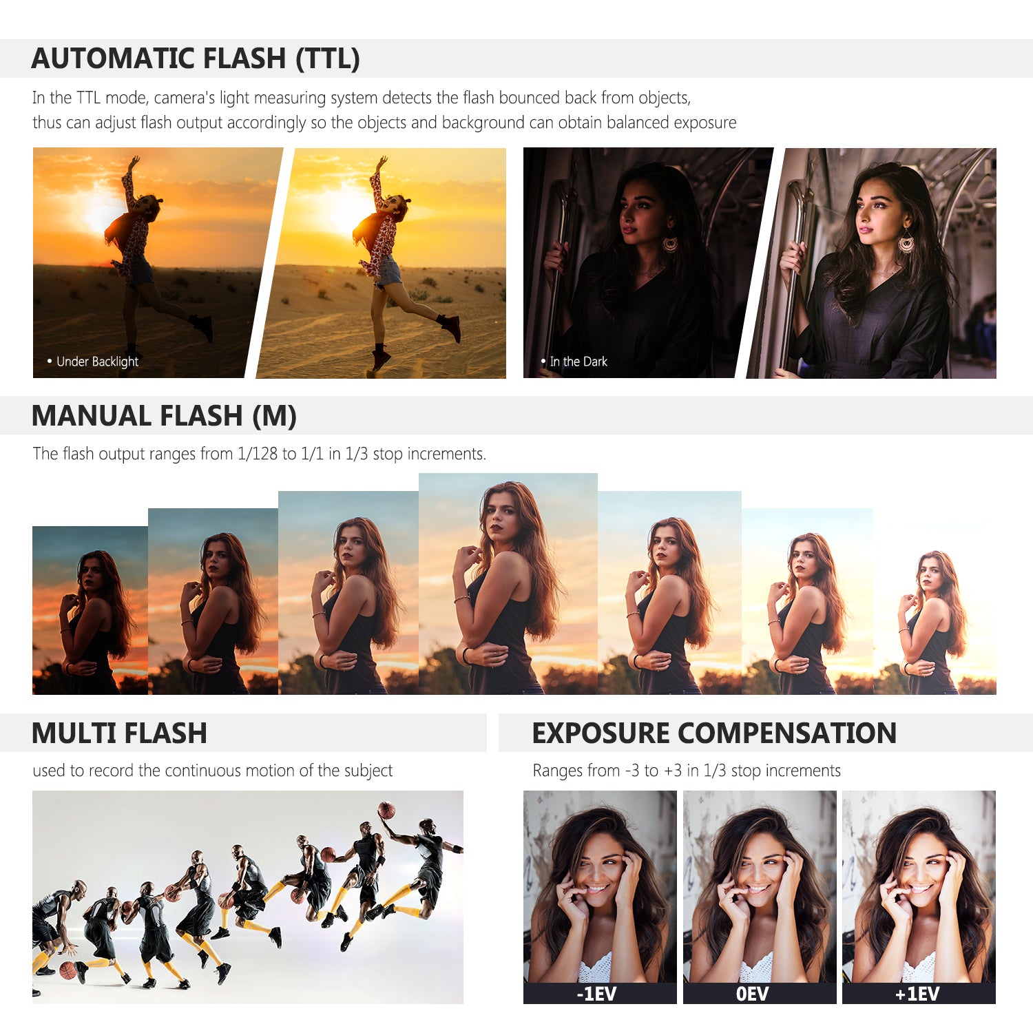 - Modos de flash: inalámbrico desactivado, TTL/M/MUTIL (compatible con compensación de exposición del flash)