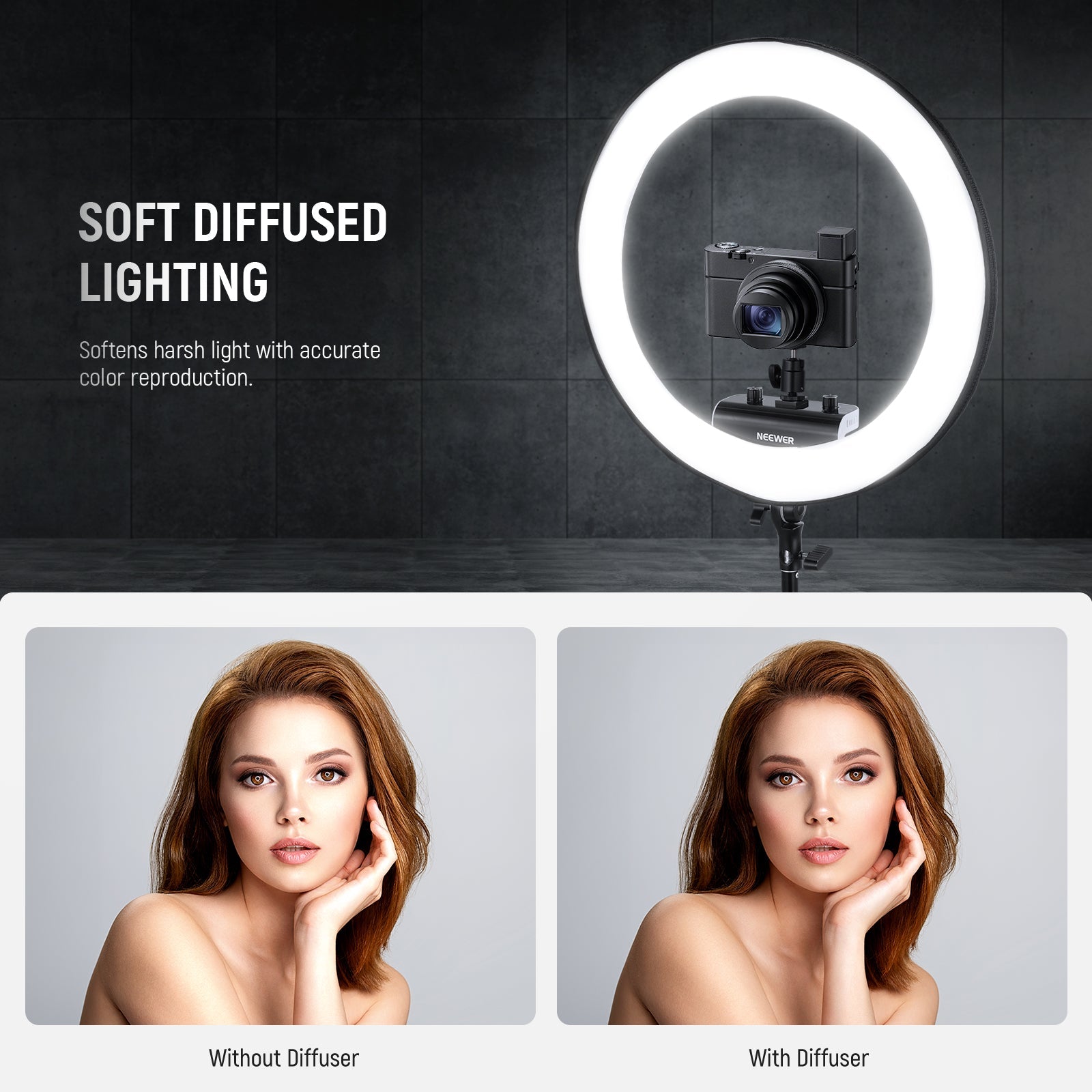 - Luz suave y uniforme : este difusor tiene la forma de un plato de belleza con una cubierta negra profesional y funciona como una puerta de granero con panel LED para evitar fugas de luz y crear un anillo de luz con un borde más nítido, lo que reduce el brillo y el deslumbramiento, creando una luz suave y uniforme. iluminación uniforme para maquillaje, selfies, vlogs, transmisiones en vivo y llamadas de Zoom