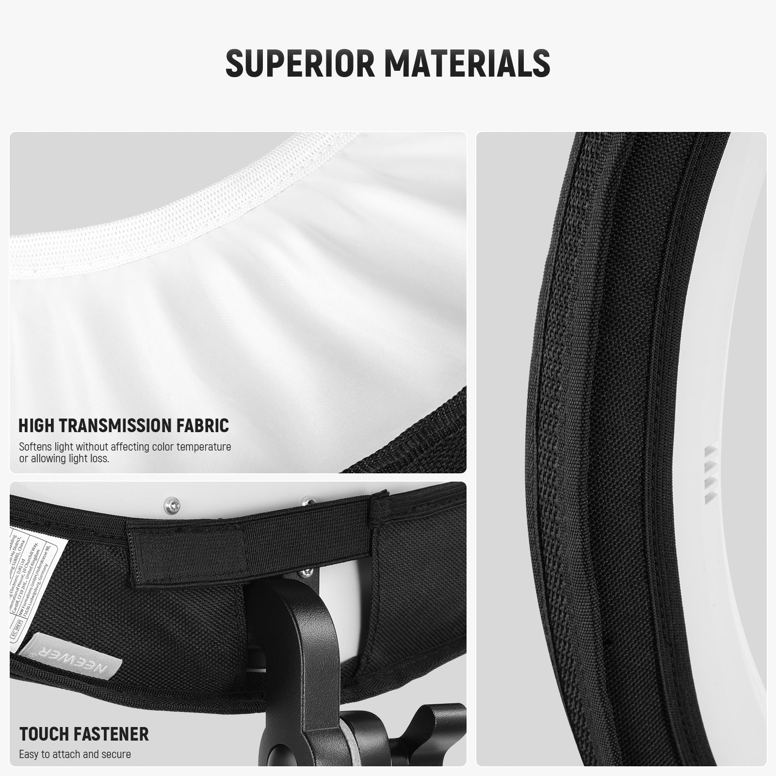 - Instalación sin esfuerzo : las bandas elásticas del difusor pueden cubrir fácilmente el anillo de luz RP18B Pro. El cierre de gancho y bucle ayuda a asegurar este difusor ajustado y evita fugas de luz.
