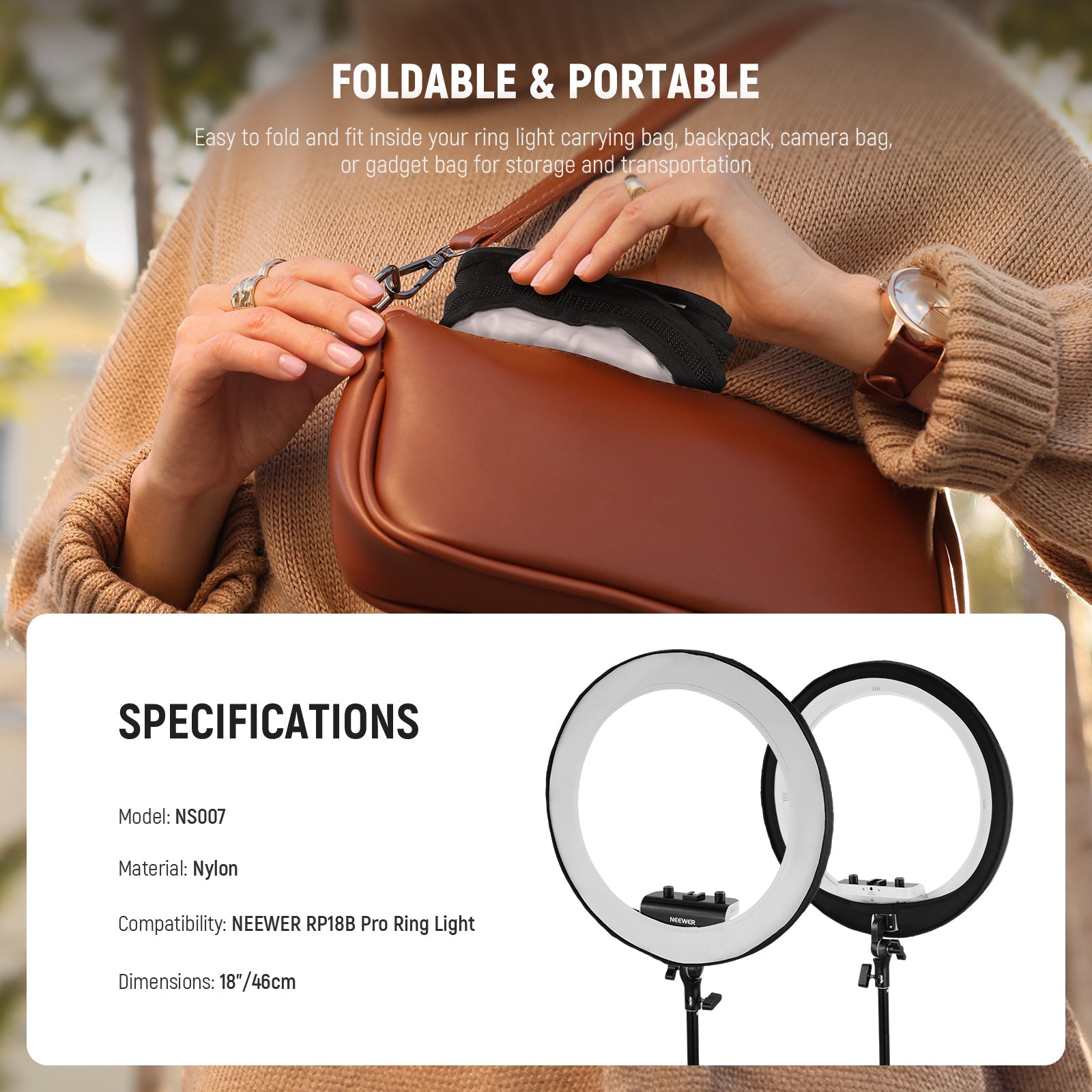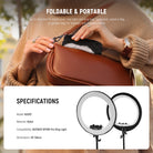 - Plegable y portátil : fácil de plegar y colocar dentro de su bolsa de transporte, mochila, bolsa para cámara o bolsa para dispositivos con luz anular para almacenamiento y transporte.