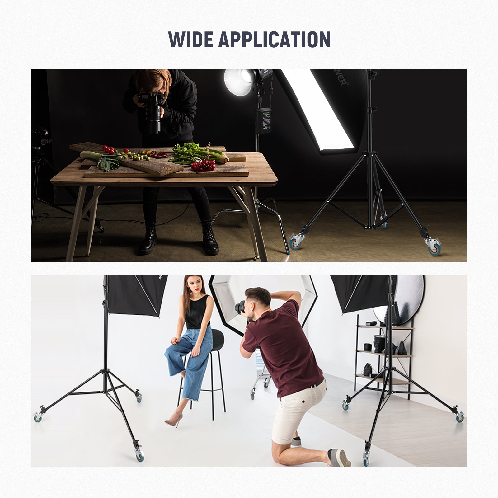 - Ruedas giratorias de 360°: estas ruedas giratorias de 360° son accesorios de fotografía esenciales que te permiten hacer rodar sin esfuerzo un soporte pesado en el suelo y cambiar su dirección en cualquier momento. Ofreciendo movilidad y estabilidad sin esfuerzo, estas ruedas para trípode simplifican el proceso de colocar su soporte de iluminación precisamente donde lo necesita.