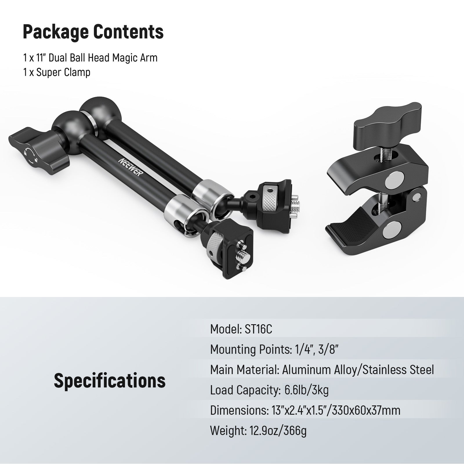 - Brazo mágico articulado con superabrazadera : Con dos brazos conectados por una junta de engranaje de fricción de 360°, la montura de abrazadera para cámara con brazo mágico con roseta de 18 cm (7") permite colocar una cámara DSLR sin espejo, un panel de luz de video LED, un micrófono, un monitor (compatible con Atomos Ninja V), un soporte para iPhone 16, 15 Pro Max Plus, Samsung, un adaptador para cámara de acción, etc. La superabrazadera se monta en varillas, postes o mesas, o se conecta a la jaula de la cámara, trípode o plataforma mediante orificios de posicionamiento de 6,35 mm y 9,5 mm para el estándar ARRI. Carga máxima: 2 kg (4,4 lb).