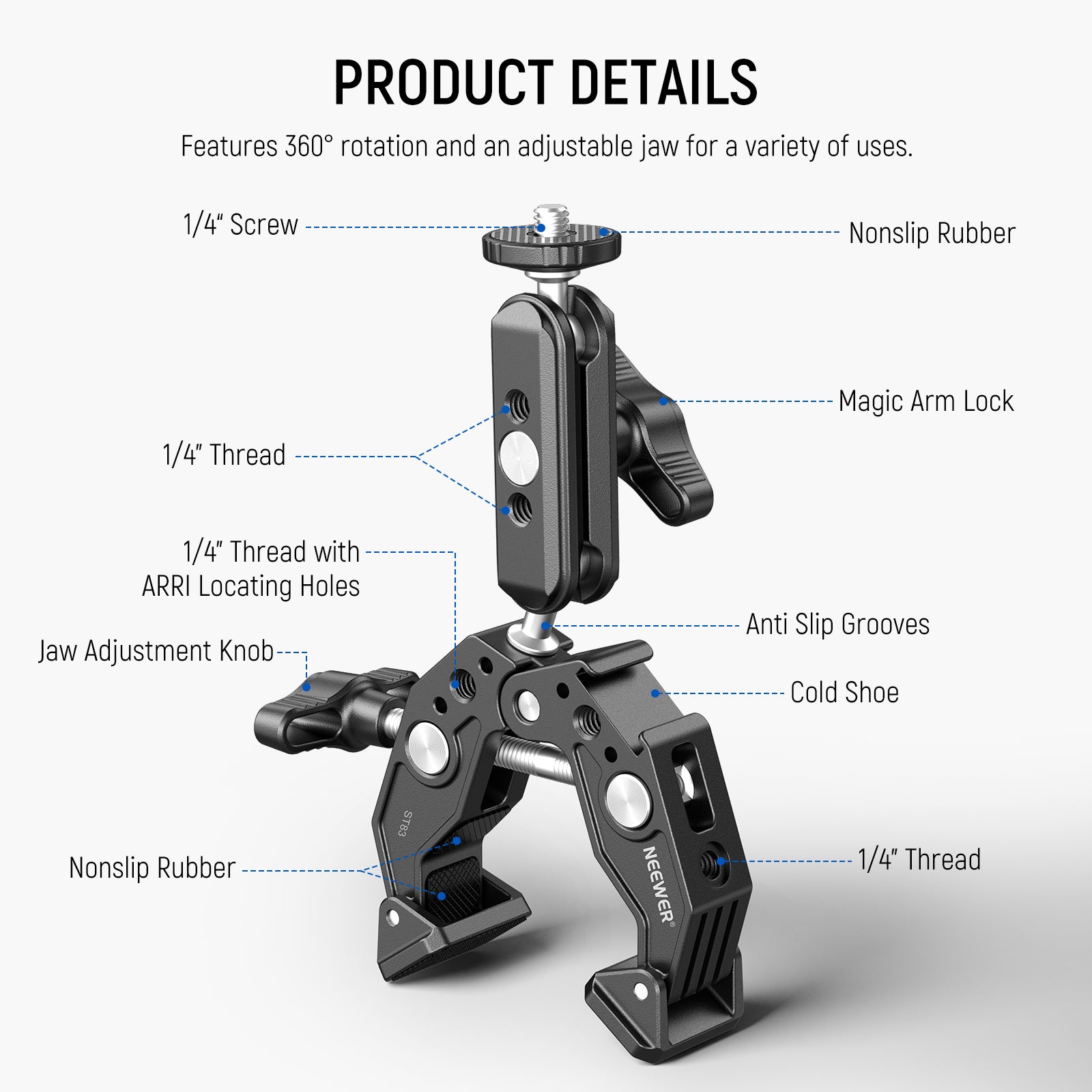 - Múltiples puntos de montaje : con roscas de 1/4", puntos de ubicación ARRI y un soporte de zapata fría integrado, la súper abrazadera y el brazo mágico pueden conectar numerosos accesorios como un monitor, un soporte para el hombro y una jaula para cámara. Un soporte de zapata fría integrado para un montaje rápido de luces de relleno LED, micrófonos y más (no apto para flashes Speedlite en la cámara)
