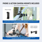 - Para cámara de acción/teléfono inteligente : el adaptador de montaje universal para cámara de acción es compatible con GoPro Hero 12 11 10 9 8 7, compatible con Insta360 ONE RONE X ONE X2 X3, compatible con DJI Osmo Action Action2 Action3, etc. Una abrazadera para teléfono ajustable de 2"-3,3" (5-8,5 cm) es compatible con iPhone 15 Pro Max 14 13, compatible con Samsung Galaxy S23 A22 y otras marcas de teléfonos inteligentes del mercado