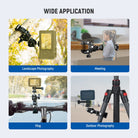 - Adaptador de rótula esférica de 360° con tornillo de 1/4" : la rótula esférica puede montar una cámara de vlogueo o una cámara sin espejo mediante un tornillo de montaje de 1/4". Los movimientos de giro de 360° e inclinación de 180° permiten al fotógrafo seleccionar el ángulo deseado. El orificio inferior para tornillo de 1/4" se adapta a otros trípodes pequeños o trípodes de vlogueo