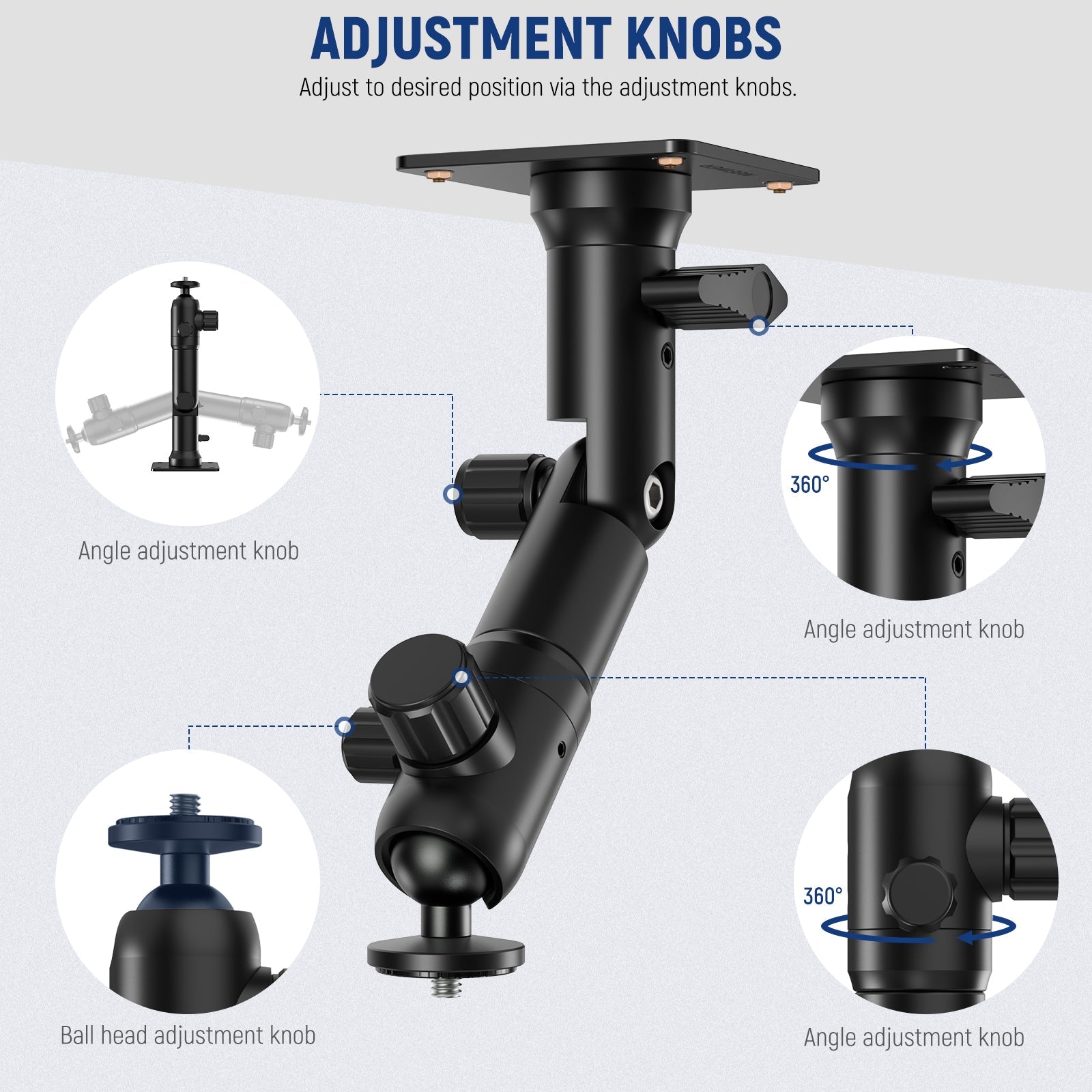 - Soporte de montaje para cámara que ahorra espacio : monte de forma segura sus dispositivos a una distancia de 2,2"/5,5 cm de la pared, el techo e incluso el escritorio, y ajústelo a voluntad para ahorrar espacio en el piso y reducir el desorden, especialmente cuando tiene espacio limitado.