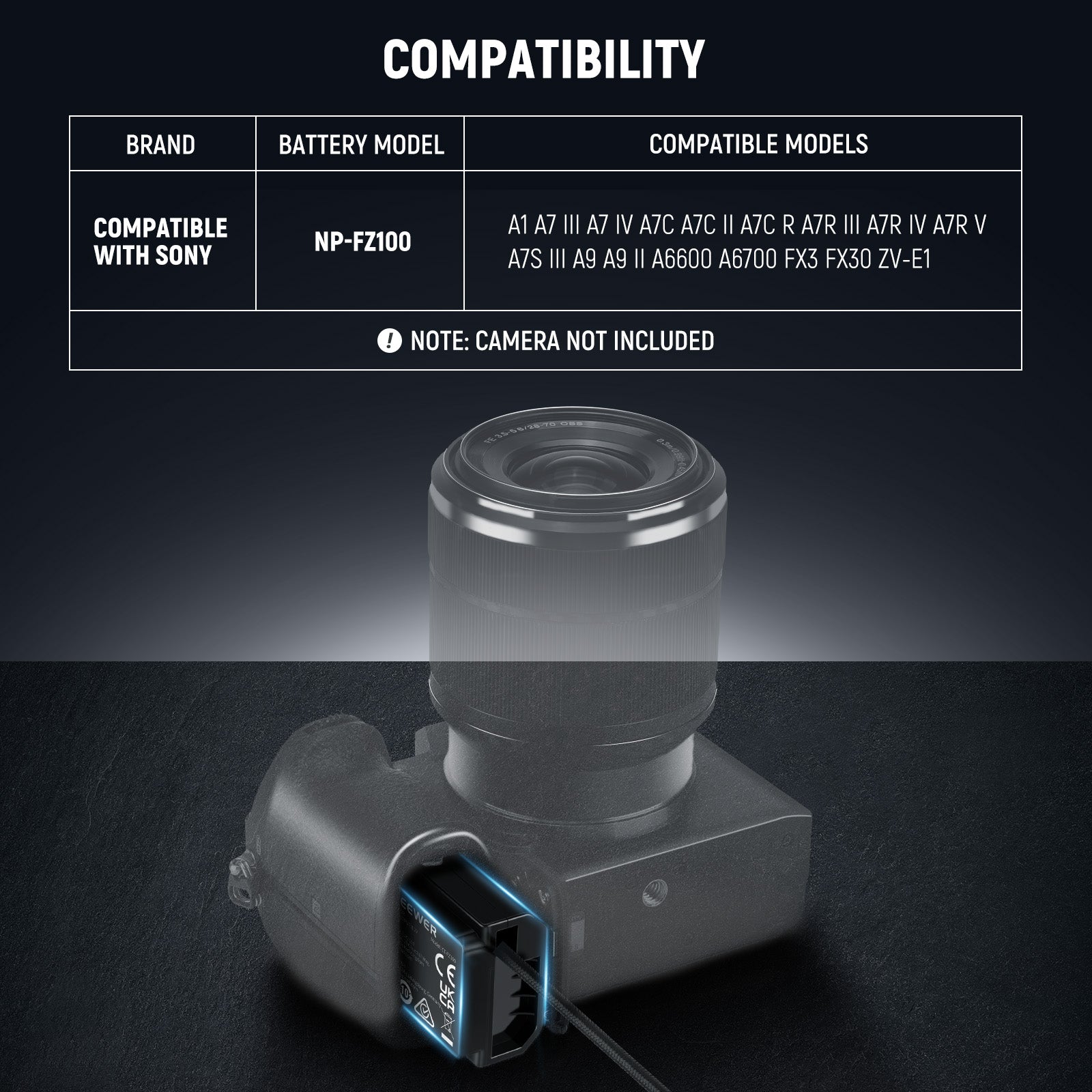 - Cámaras compatibles : la batería ficticia NEEWER USB C a NP-FZ100 es un reemplazo para la batería NP-FZ100, compatible con las cámaras Sony FX3 FX30 ZV-E1 A1 A6600 A6700 A7III A7IV A7C A7CII A7CR A7RIII A7RIV A7RV A7SIII A9 A9II