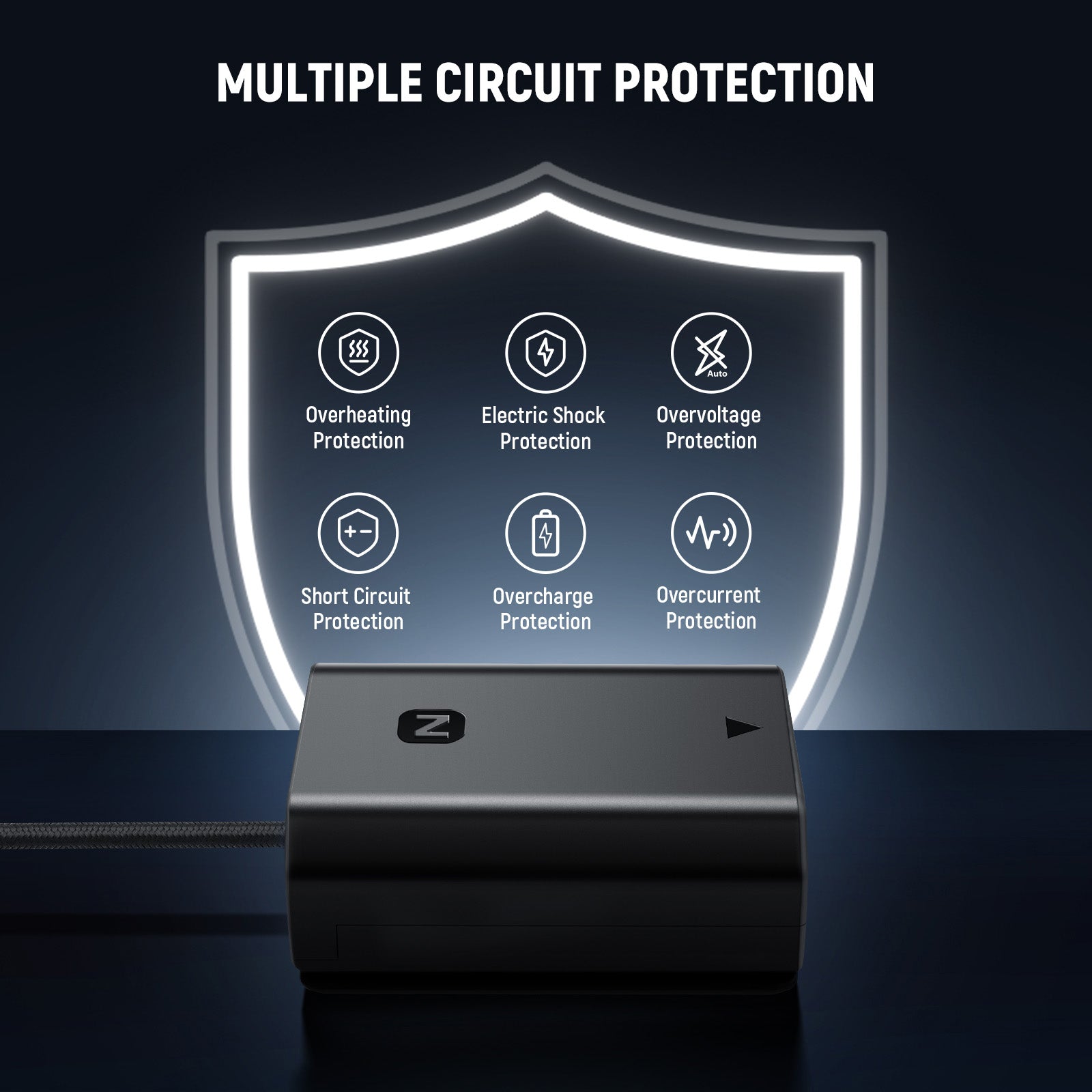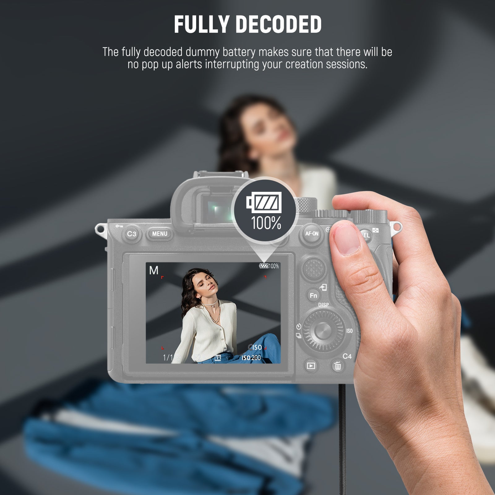 - Disparo continuo y prolongado : en comparación con la batería original con tiempo de funcionamiento limitado, esta batería ficticia NP-FZ100 ofrece energía constante desde fuentes USB C, lo que garantiza sesiones de grabación prolongadas sin interrupciones. Simplemente inserte la batería ficticia en su cámara, conecte el extremo USB C a una fuente de alimentación y estará listo para comenzar.